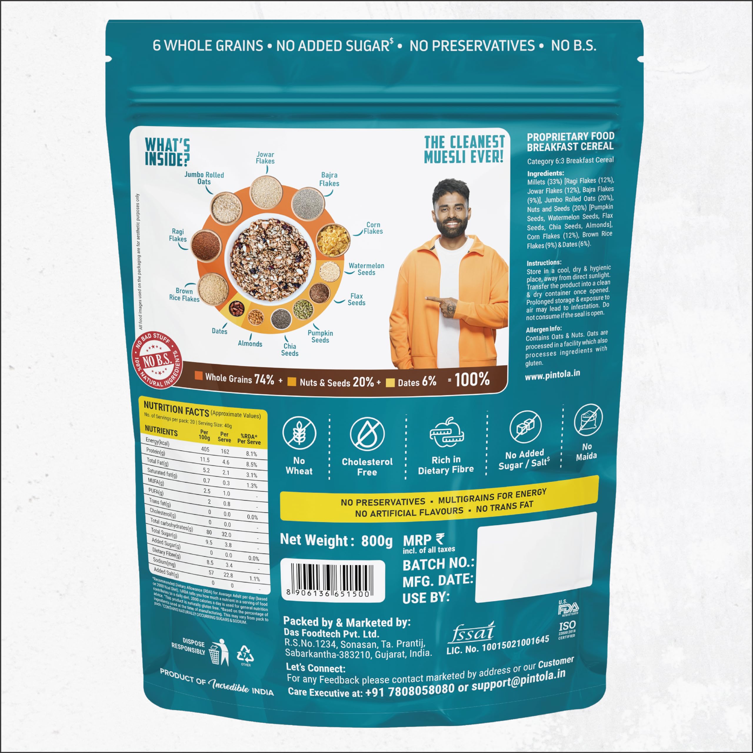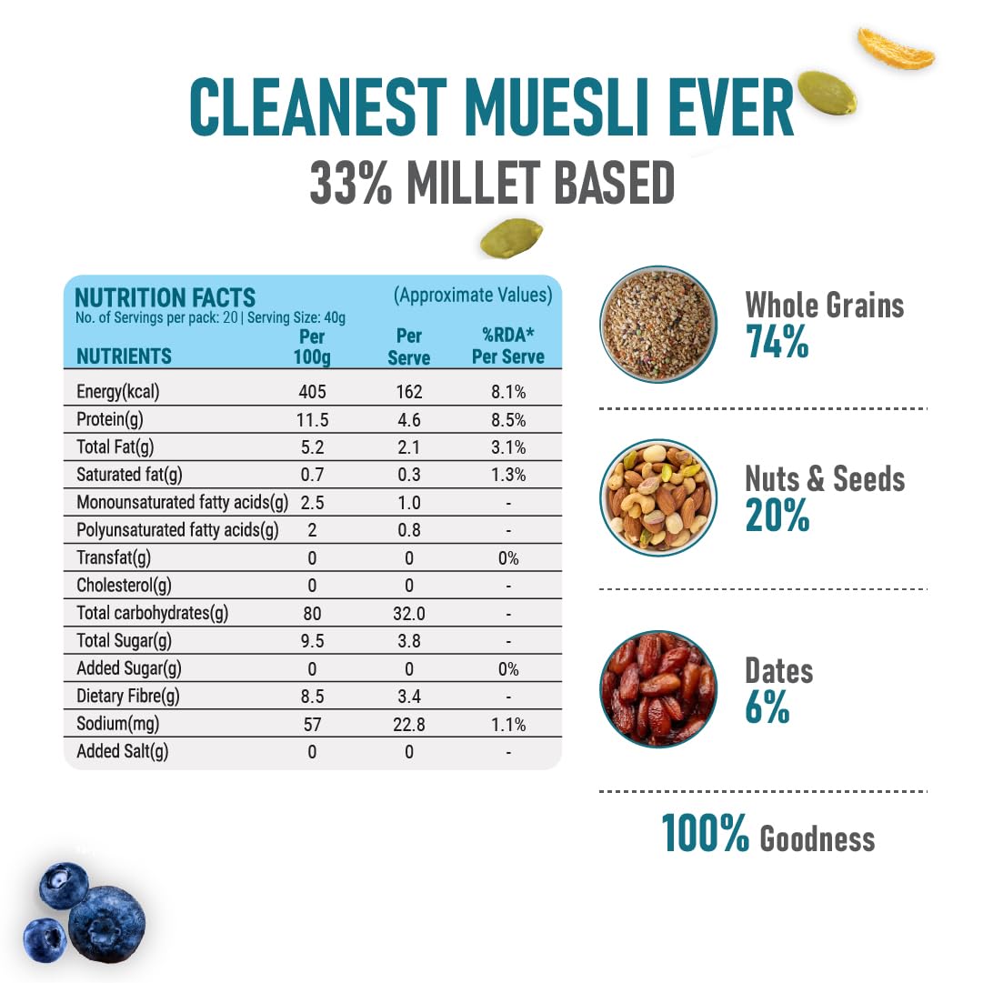 100% NATURAL INGREDIENTS: 100% Natural No Compromises. Our muesli is made with pure ingredients free from preservatives added salt added sugar or artificial flavours. Experience the true taste and health benefits of real whole grains and seeds.
