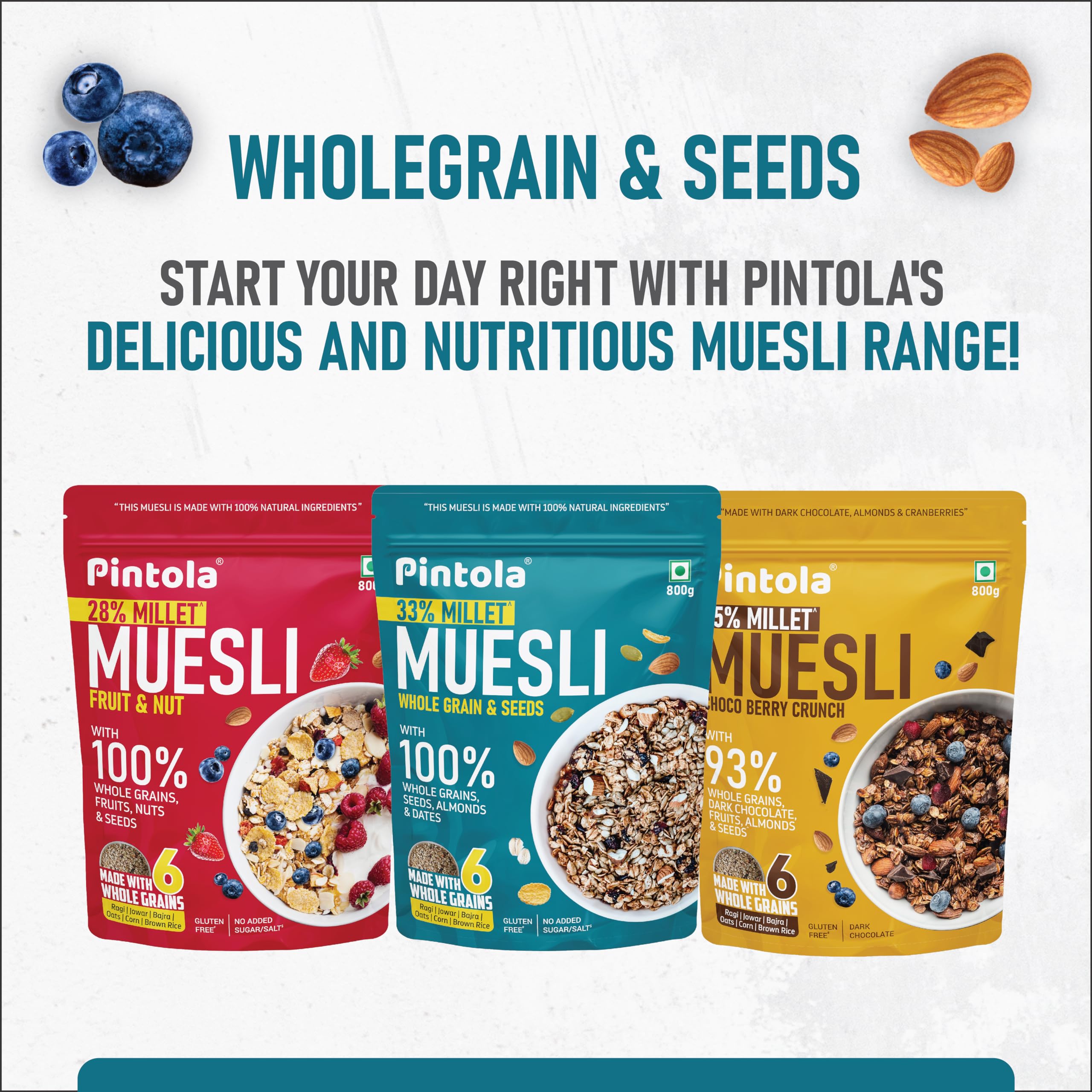 Pintola Wholegrain & Seeds Muesli with 33% Millet 800g Cereals for Breakfast with 26% Nuts Seeds & Dates No Preservatives Rich in Dietary Fibre & Protein Cholesterol & Gluten Free No Added Sugar
