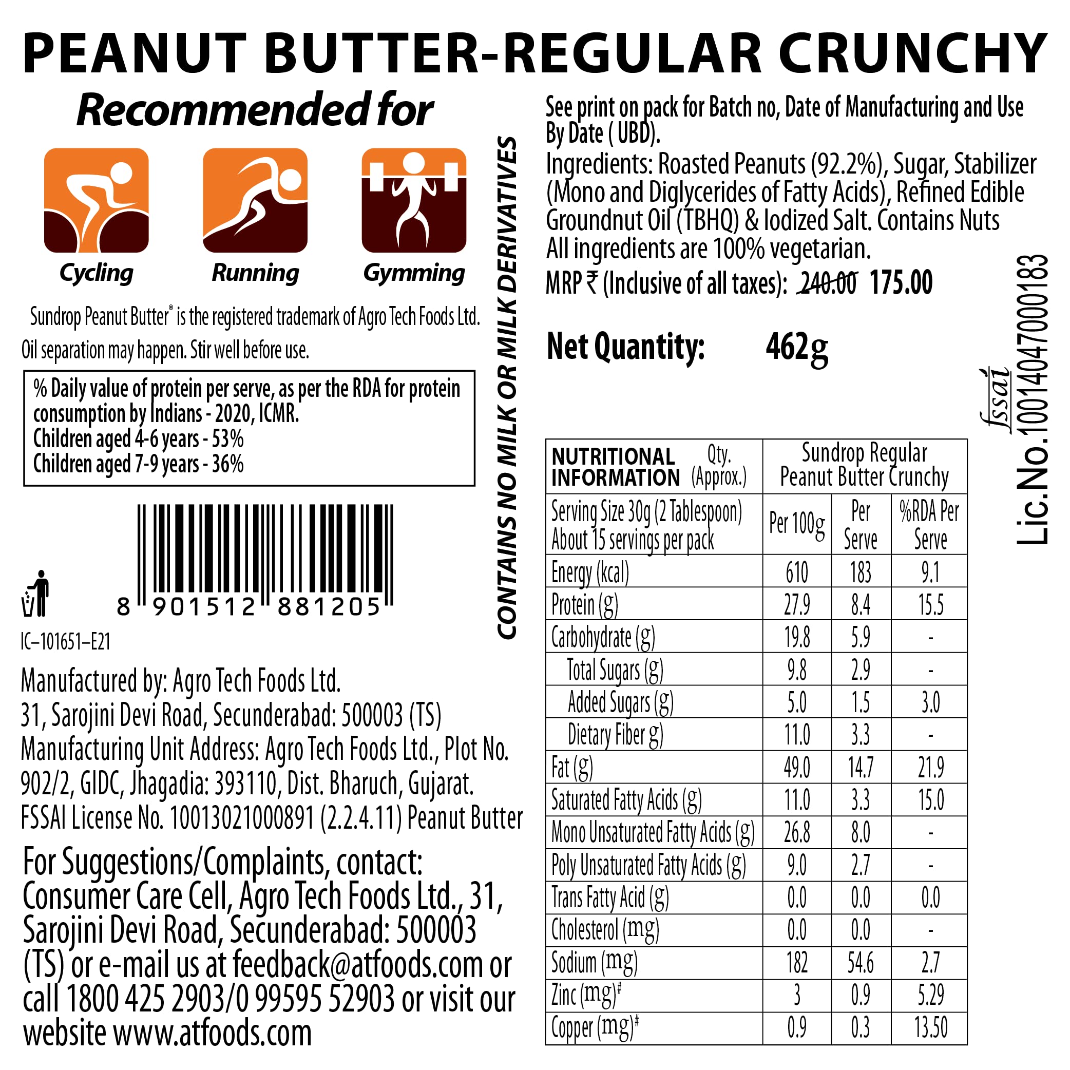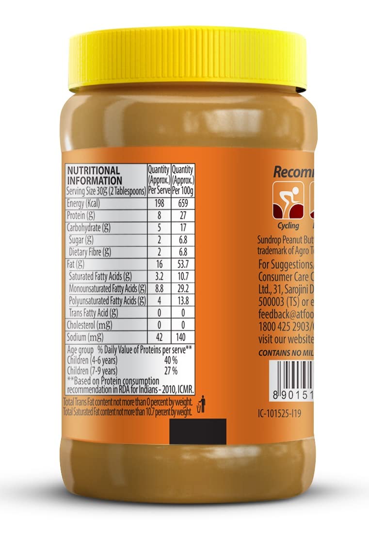 A peanut butter and jelly sandwich is probably the most popular breakfast especially with children. The sundrop crunchy peanut butter promises to give you that wonderful taste of peanut butter each time all the time. It can be the perfect start to your day or just a delicious way to plug that afternoon energy void. Peanuts are natural source of rich energy and nutrients. High on nutrition sundrop crunchy peanut butter is deliciously crunchy and goes well with a number of fillings letting you be innovative with your sandwiches. Each bite of its crunchy goodness is not only good for your mood but also for your body as it provides you with raw energy and nutrition without the guilt of cholesterol.