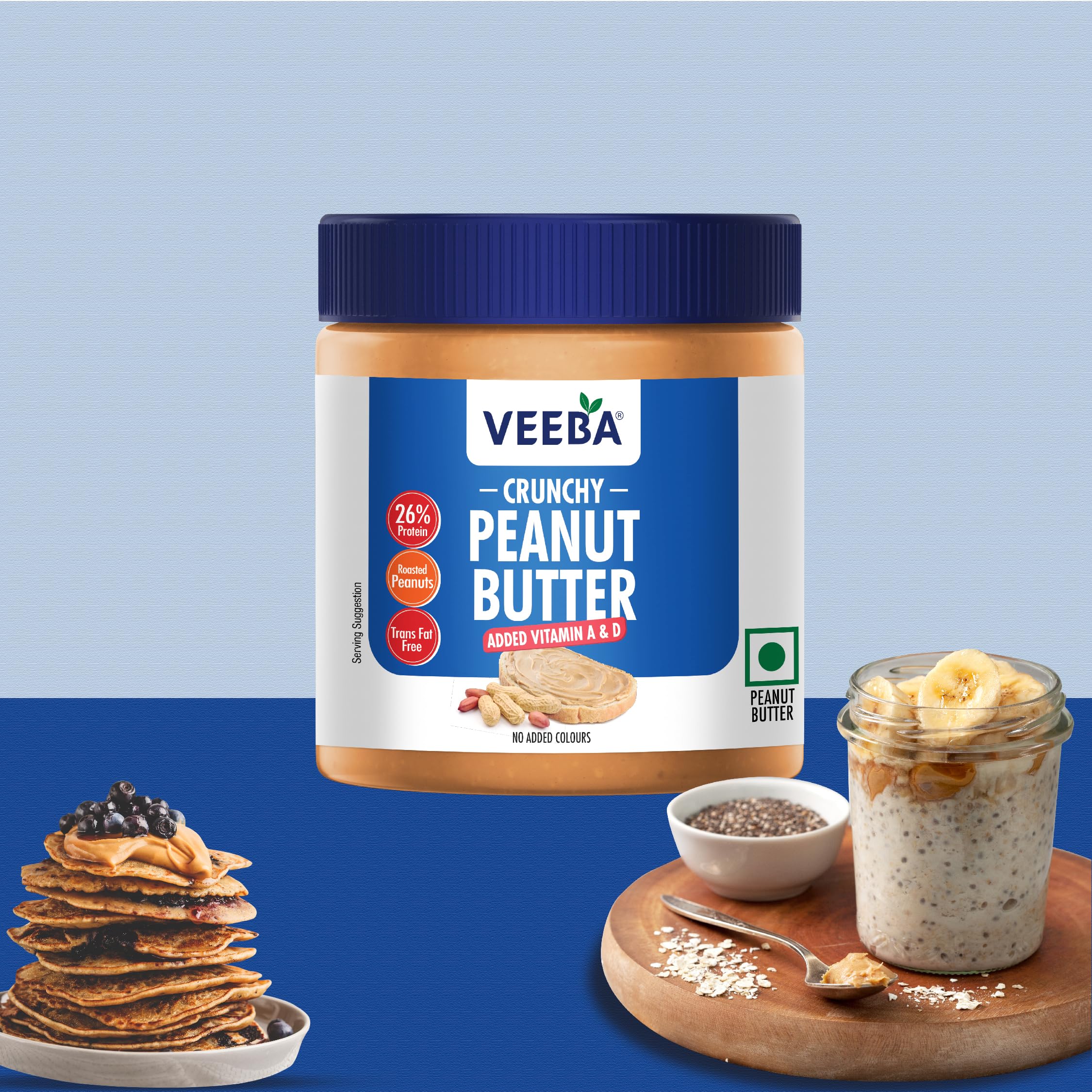 Veeba Peanut Butter Crunchy is 100% vegetarian and is made with 91% roasted peanuts. It is powered by protein and enriched with calcium iron Vit A and Vit D. Ideal for making milkshakes sandwiches.