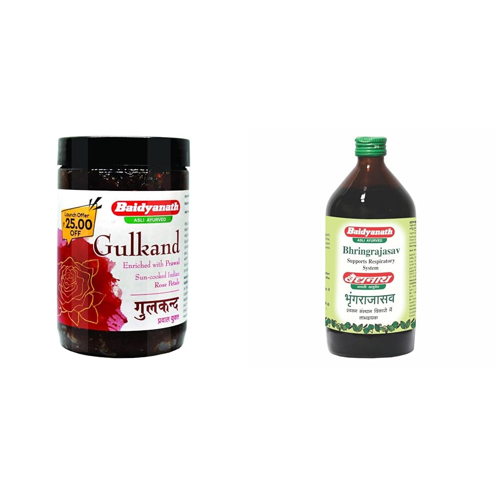 Baidyanath Gulkand Gummy Enriched with Prawal Sun-cooked Indian (Rose Petal Jam) - 400gram & Baidyanath Bhringrajasava 450 ml Syrup |Made with Natural Ayurvedic Ingredients