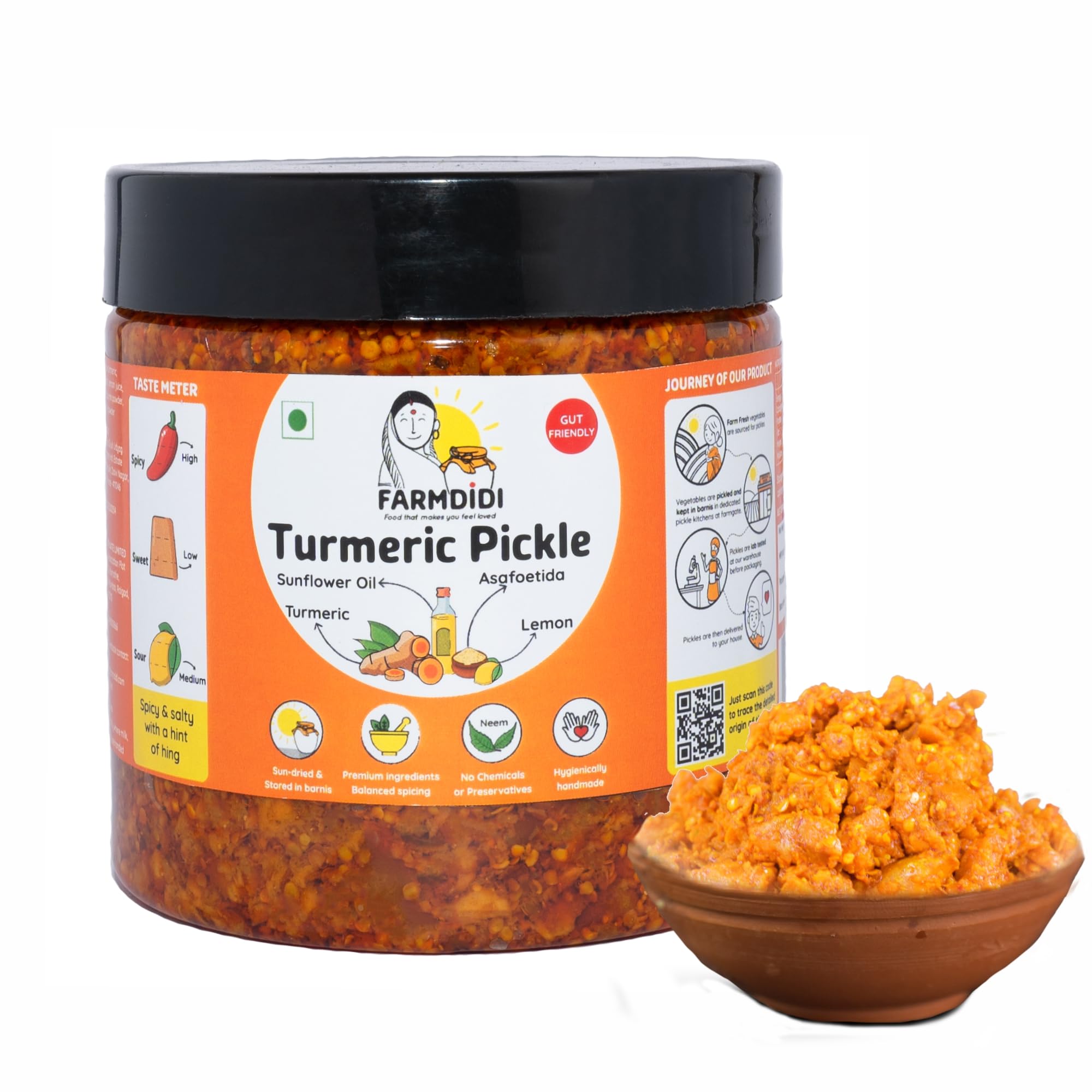 • HOMEMADE LOVE Our homemade turmeric pickle is just what you need to spice up your meals! Made with fresh raw turmeric and homegrown spices this savory pickle is the perfect addition to parathas rice and all your daily meals.