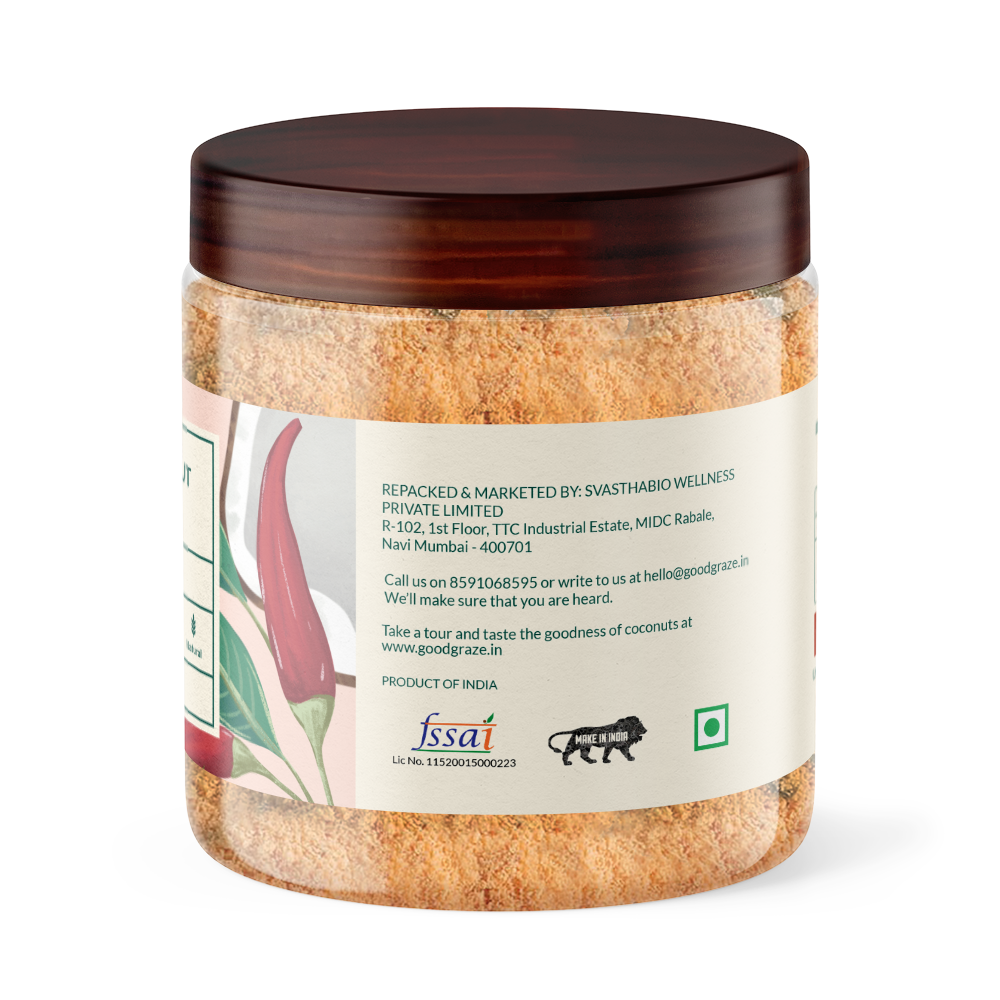 Good Graze Red Coconut Chutney is a mix that is an on-the-go premix that can be used anytime anywhere. All it needs is just water and the chutney is ready to serve. Good Grazes coconuts are grown in natural spring water. The source of our coconuts nutrition comes fully and directly from the natural spring water immersed in the land. This rare system provides the earth with that benefit the fruit bearing coconut trees. This natural spring water is of high quality & has extensive mineral content. One can only imagine the positive inence this water would create on its surrounding flora and fauna.
