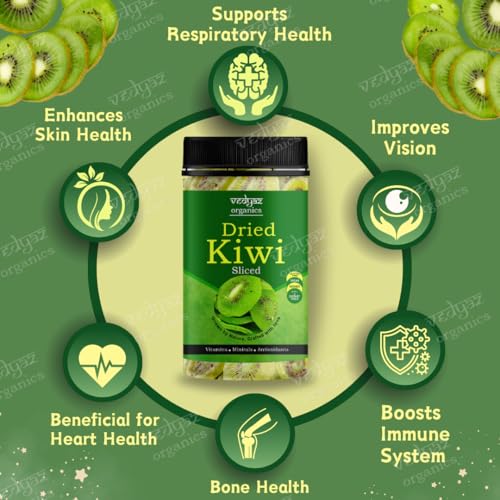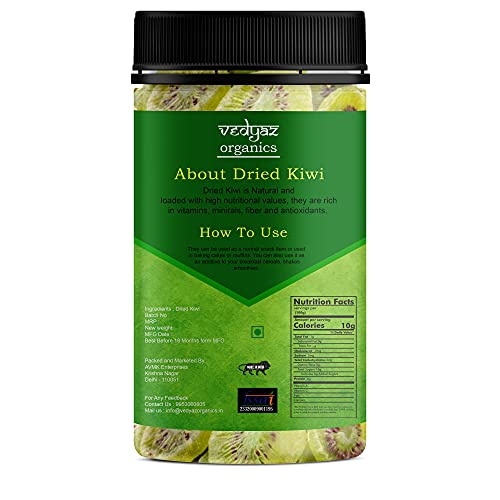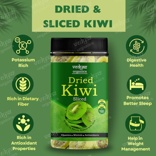 Vedyaz Organics Dried kiwi fruits are naturally dehydrated and free fro artificial flavor and coloring.