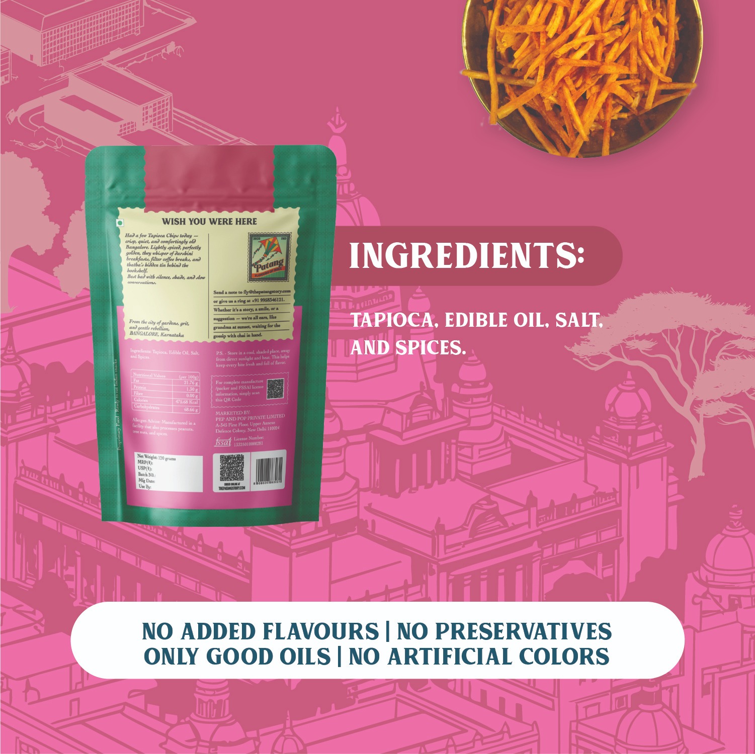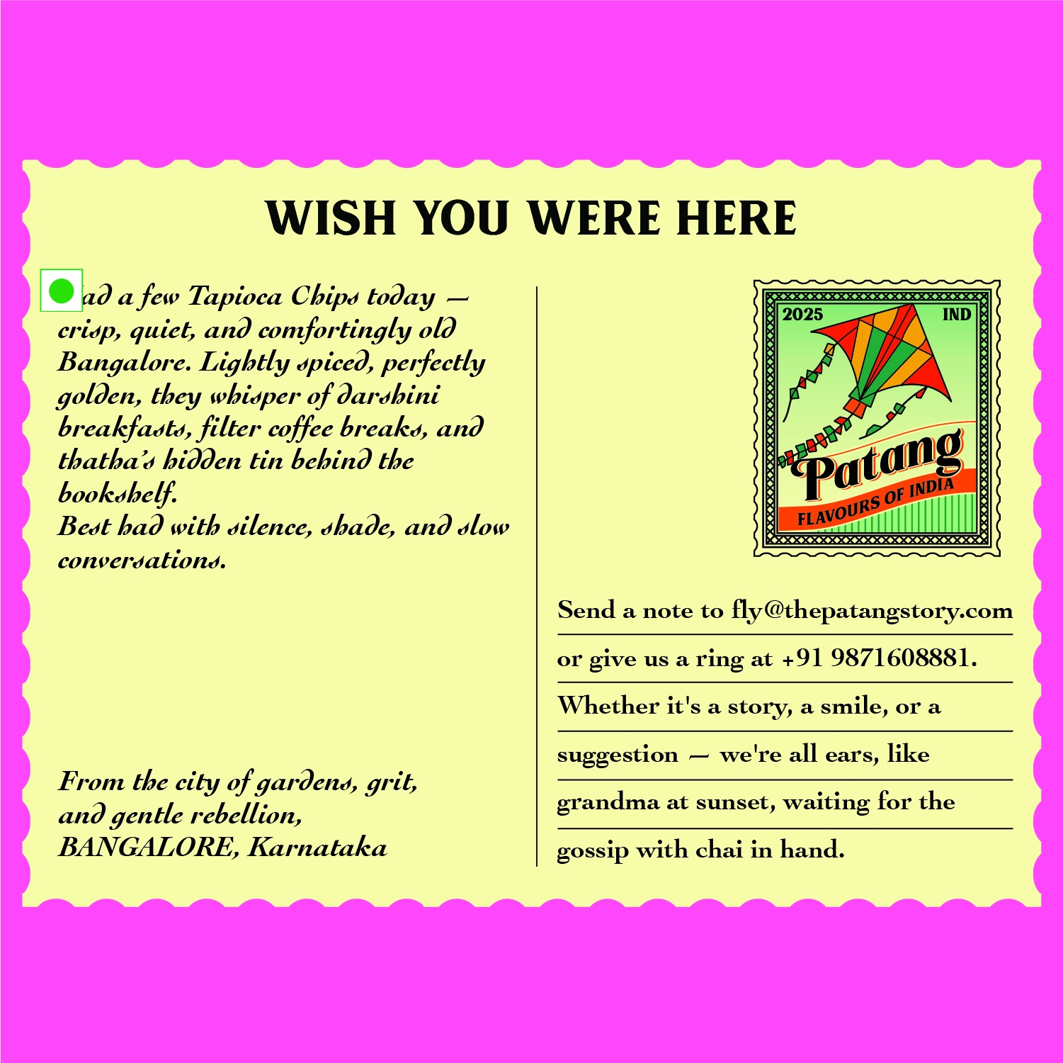 There’s a quiet comfort to Bangalore, and these chips carry that calm in every bite. Thin-sliced tapioca, slow-fried for an honest crunch, lightly salted, and finished with gentle spices. The flavour is clean, warm, and familiar, like a filter-coffee break under a raintree.