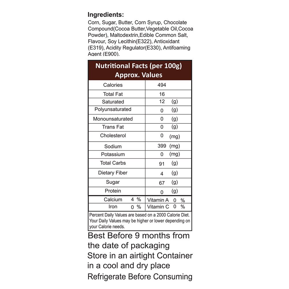 Bogatchi mr. Popp corn are handcrafted in old-fashioned copper kettles one batch at a time this popcorn is a crunchy and buttery caramel delight. Crafted in the India from quality ingredients. This caramelized popcorn is gluten-free cholesterol free and features non-gmo popcorn. It is high in dietary fiber and calcium. This caramel popcorn makes a great snack on the go for school work and home. Perfect snacks for movie time binge watching tv series marathon exam time snacking or just to make your self feel good. Bogatchi mr.Popp corn makes the best gift for celebration occasions like rakhi diwali anniversary birthday x-mas with loved ones. The chocolate caramel popcorn has dark chocolate dripped on the top of caramelized popcorn making these yummy. You will find chocolate on each and every bite of the popped corns. Enjoy with family and friends!