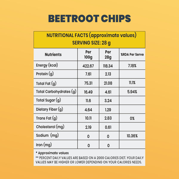 Crunch into goodness with Healthy Beetroot Chips naturally sweet, perfectly crispy, and packed with nutrients. A tasty, guilt-free snack that blends earthy beet flavor with wholesome crunch! (Net Weight: 36 gms)
