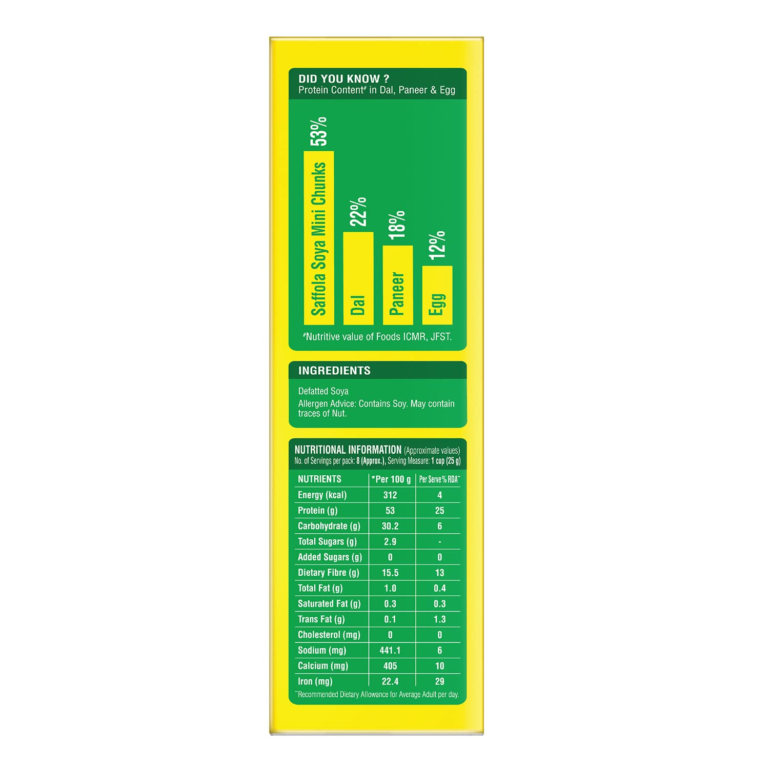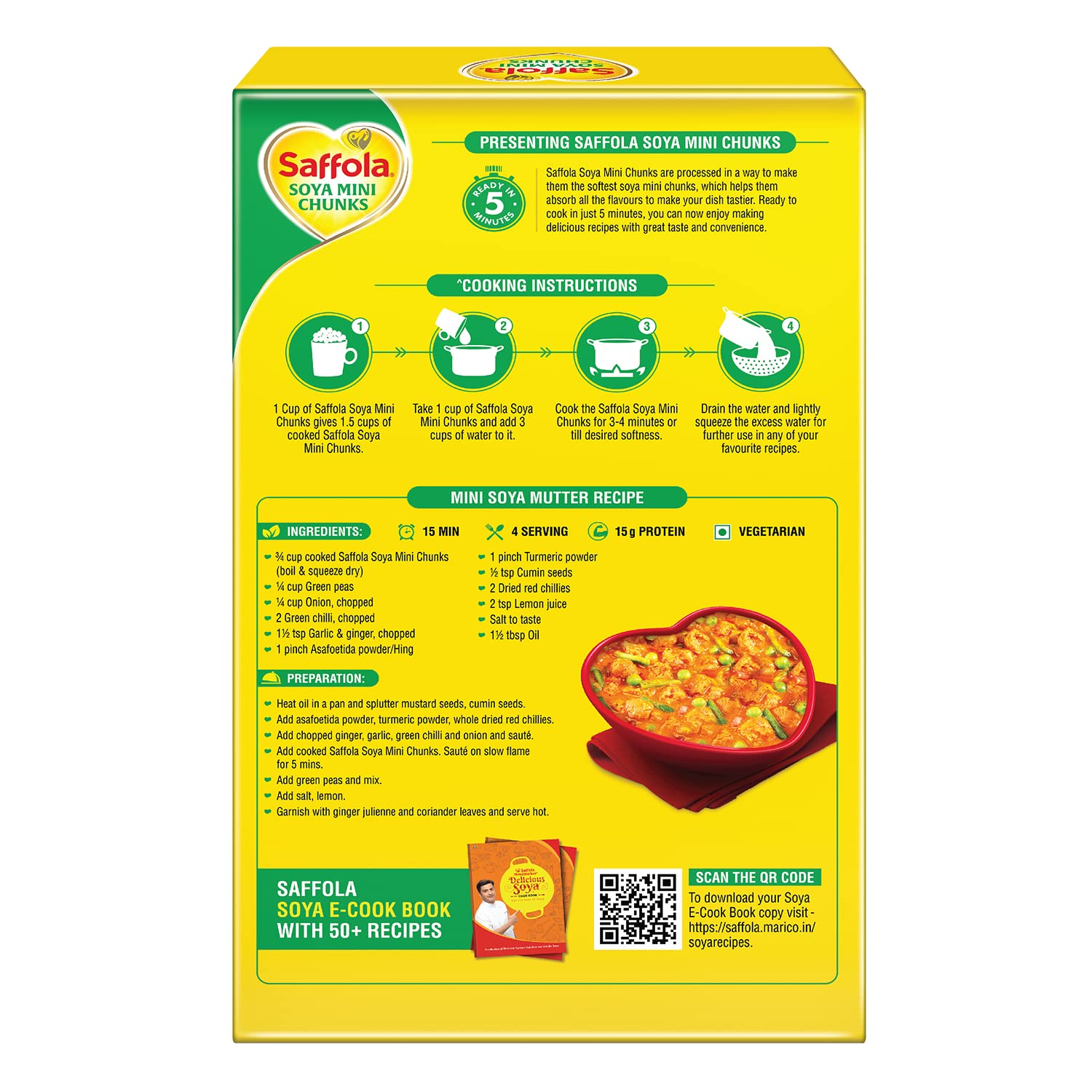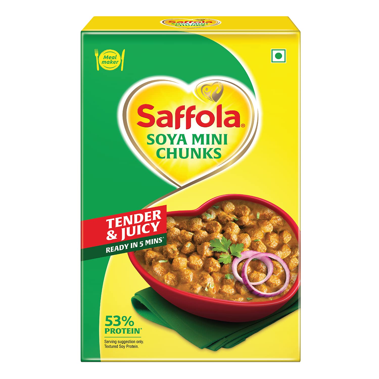 Presenting Saffola Soya Mini Chunks are processed in a way that ensures the soya mini chunks remain super soft and absorbs the flavour so well which makes your soya mini chunk dish tasty. Saffola Soya Mini Chunks is manufactured by extrusion of defatted soya flour from healthy soya seeds. We choose our ingredient carefully analyse & balance the key nutritional factors like protein dietary fibres etc. to ensure optimum quality. Finally it is extruded with strict process control to obtain soya chunks which cooks softer so that you can enjoy tender juicy and tasty chunks. It is High in Protein - 53% High in Fibre - 13% & Low in Fat (Nutritive value of Foods ICMR JFST) which aids your Family's nutrition thanks to the goodness of protein and fibre and adds great taste to their everyday food with the tender & juicy soya chunks. Chilli Soya Soya Aloo curry Soya Mutter & Soya Biryani are some of the dishes that will taste good with Saffola Mealmaker Soya Chunks. Now every soya dish will be delicious. Try Saffola Mealmaker Soya Chunks -Tasty Super Soft Soya Chunks. Soya chunk also known as soya wadi soya nuggets soya badi soyabean badi.