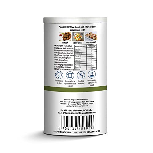 Introducing Chukde Chaat Masala - the blend of tangy spicy and sweet flavors that will take your chaat snacks to the next level Our pack of Chaat Masala is made with the finest quality ingredients including iodized salt dry mango black salt cumin pomegranate seeds coriander mint leaves kachri tamarind black pepper dry ginger yellow chili clove nutmeg carom seeds caraway seeds and asafoetida. Chaat Masala is a popular Indian spice blend that is commonly used as a seasoning for chaat snacks and street food. It is a savory spice mix that s a flavor to a variety of dishes. The exact blend of spices used in chaat masala can vary depending on the region and the recipe but our Chukde Chaat Masala contains all the essential ingredients to give you an authentic taste of Indian street food. Not only is Chukde Chaat Masala for chaat dishes such as samosas papdi chaat and aloo tikki but it o makes a great seasoning for fresh fruits and other snacks. With its tangy and spicy flavor our Chaat Masala is sure to become a popular ition to your spice collection. Our Chaat Masala comes in a 100 Gm pack making it easy to store and use. So why wait Chukde Chaat Masala to your cart today and enjoy the taste of popular Indian seasoning in your own home