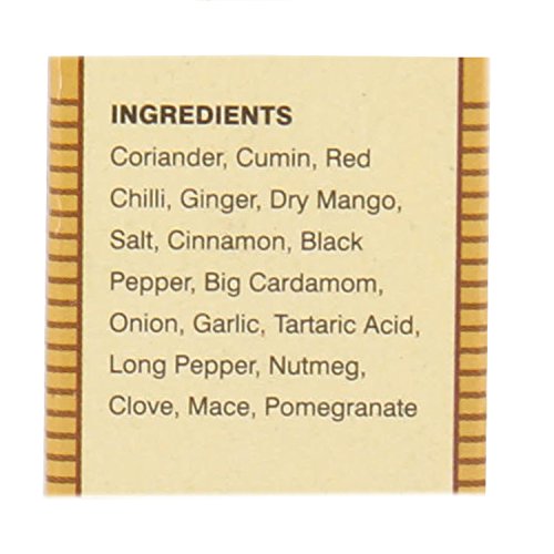 Contains coriander cumin red chilli ginger dry mango salt cinnamonblack pepper big cardamom onion garlic tartaric acidlong pepper nutmeg clove mace pomegranate