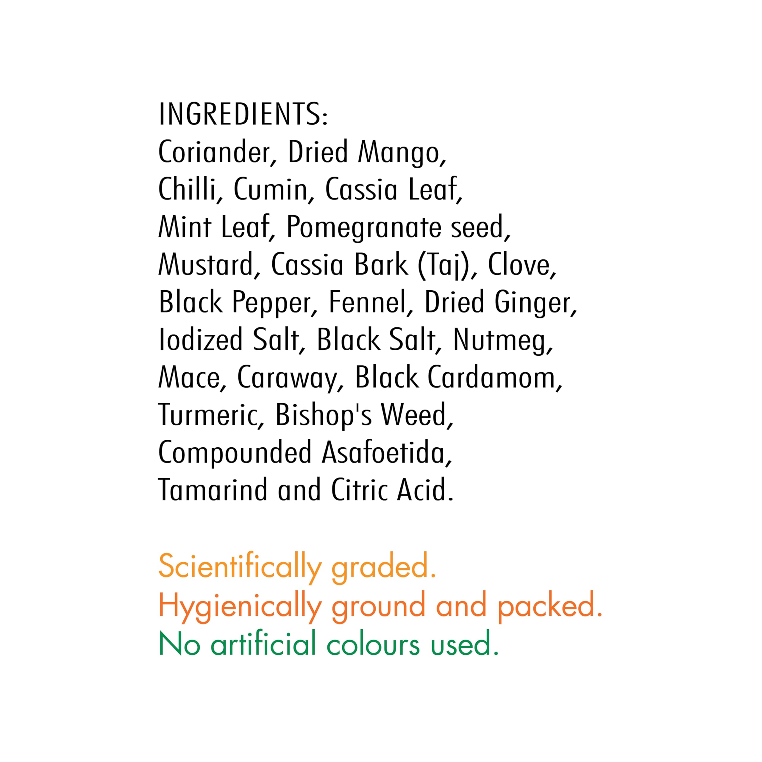 An exquisite blend of 24 pure spices this is perhaps the most elaborate blend in the Everest repertoire. This blend is evenly balanced for taste and flavour and imparts a rare character to chhole made from chickpeas.
