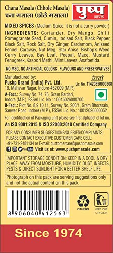Product Features:- Fresh and 100% natural Made in India Easy to make Blend of perfect spices Add magic to your dishes Product Highlights:- âINGREDIENTS:- Coriander Dry Mango Red Chilli Cumin Pomegranate Seeds Black Pepper Cloves Dry Ginger lodised Salt Black Salt Cardamom Aniseed Fennel Caraway Nut Meg Star Anise Bishop's Weed Curry Leaves Bay Leaf Peepal Mace Mustard Fenugreek Kasuri Methi Mint Leaves Asafoetida. âEasy to prepare:- When you have Pushp chana masala in your hands you don't have to worry about the taste and flavor of your meals. All the Indian spices incorporate in one masala which will give you the melt watering taste and make your food flavoring and appealing. âQuality control:- Quality control is the quintessential aspect of any product. And we take care of it with utmost priority. For providing premium quality products at your home our team has keenly monitored all the products. Pushp chana masala has passed all the quality checks and hence it has become the number one choice of all Indian families and their kitchens. âBlend of natural spices:- Pushp chana masala has the perfect combination of all the Indian spices that make your food healthy appealing and delicious. All the Indian spices and seasonings have grounded at low speed that ensures the preservation of the natural oils. And you will get the perfect recipe of a restaurant directly to your kitchen.