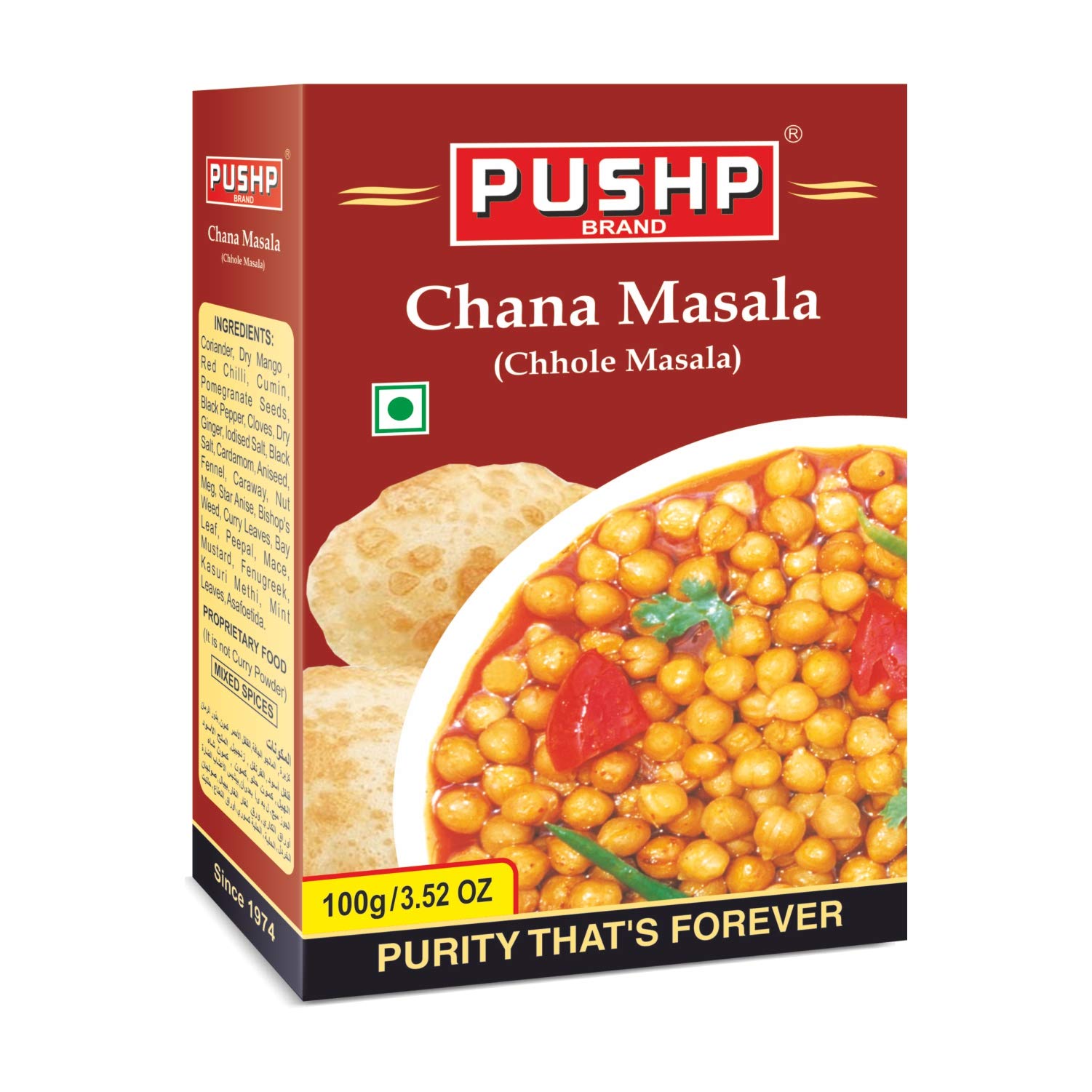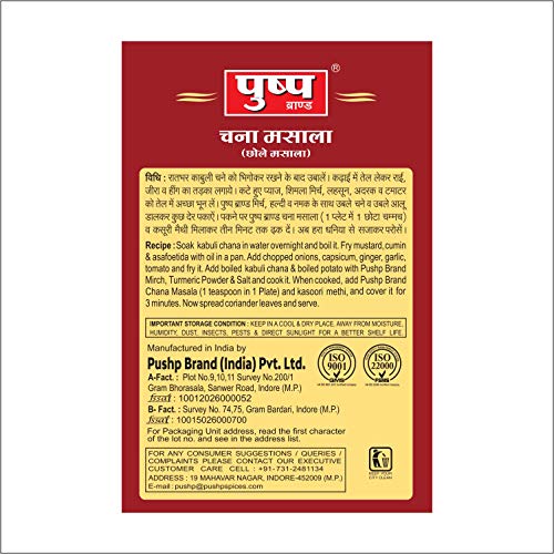 Product Features:- Fresh and 100% natural Made in India Easy to make Blend of perfect spices Add magic to your dishes Product Highlights:- âINGREDIENTS:- Coriander Dry Mango Red Chilli Cumin Pomegranate Seeds Black Pepper Cloves Dry Ginger lodised Salt Black Salt Cardamom Aniseed Fennel Caraway Nut Meg Star Anise Bishop's Weed Curry Leaves Bay Leaf Peepal Mace Mustard Fenugreek Kasuri Methi Mint Leaves Asafoetida. âEasy to prepare:- When you have Pushp chana masala in your hands you don't have to worry about the taste and flavor of your meals. All the Indian spices incorporate in one masala which will give you the melt watering taste and make your food flavoring and appealing. âQuality control:- Quality control is the quintessential aspect of any product. And we take care of it with utmost priority. For providing premium quality products at your home our team has keenly monitored all the products. Pushp chana masala has passed all the quality checks and hence it has become the number one choice of all Indian families and their kitchens. âBlend of natural spices:- Pushp chana masala has the perfect combination of all the Indian spices that make your food healthy appealing and delicious. All the Indian spices and seasonings have grounded at low speed that ensures the preservation of the natural oils. And you will get the perfect recipe of a restaurant directly to your kitchen.