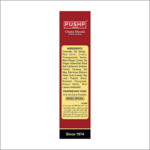 Product Features:- Fresh and 100% natural Made in India Easy to make Blend of perfect spices Add magic to your dishes Product Highlights:- âINGREDIENTS:- Coriander Dry Mango Red Chilli Cumin Pomegranate Seeds Black Pepper Cloves Dry Ginger lodised Salt Black Salt Cardamom Aniseed Fennel Caraway Nut Meg Star Anise Bishop's Weed Curry Leaves Bay Leaf Peepal Mace Mustard Fenugreek Kasuri Methi Mint Leaves Asafoetida. âEasy to prepare:- When you have Pushp chana masala in your hands you don't have to worry about the taste and flavor of your meals. All the Indian spices incorporate in one masala which will give you the melt watering taste and make your food flavoring and appealing. âQuality control:- Quality control is the quintessential aspect of any product. And we take care of it with utmost priority. For providing premium quality products at your home our team has keenly monitored all the products. Pushp chana masala has passed all the quality checks and hence it has become the number one choice of all Indian families and their kitchens. âBlend of natural spices:- Pushp chana masala has the perfect combination of all the Indian spices that make your food healthy appealing and delicious. All the Indian spices and seasonings have grounded at low speed that ensures the preservation of the natural oils. And you will get the perfect recipe of a restaurant directly to your kitchen.