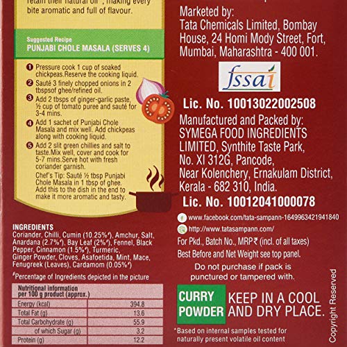 Tata Sampann's Punjabi Chole Masala is a scientifically processed blended masala of selected varieties of whole spices. This blend is a creation of master chef Sanjeev Kapoor which ensures the right spices are used in the right proportion to make every dish taste amazing. International standards of processing ensure consistent quality making it the favourite choice.