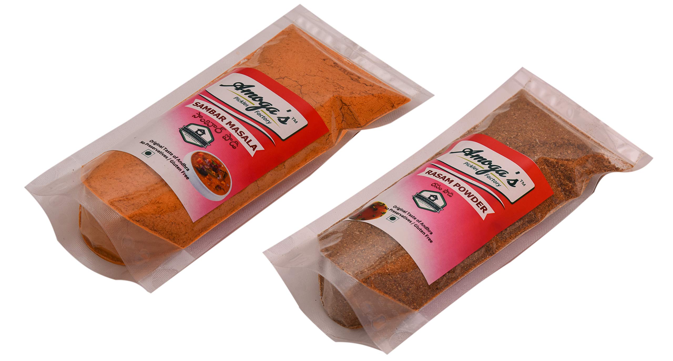 Sambar Podi from Andhra has an authentic flavorthe preparation of sambar is so easy and Tasty with Amoga's Pickles Factory Sambar Powder.We use all rich ingredients The Aroma was kept air tight.Adding Vegetables and Desi ghee gives you a nice mouth watering taste which can be enjoyed with Idli Vada Dosa & Hot Hot Rice. Rasam Podi from Andhra has an authentic flavorthe preparation of Rasam is so easy and Tasty with Amoga's Pickles Factory Sambar Powder.We use all rich ingredients The Aroma was kept air tight.Adding Vegetables and Desi ghee gives you a nice mouth watering taste which can be enjoyed with Hot Hot Rice.