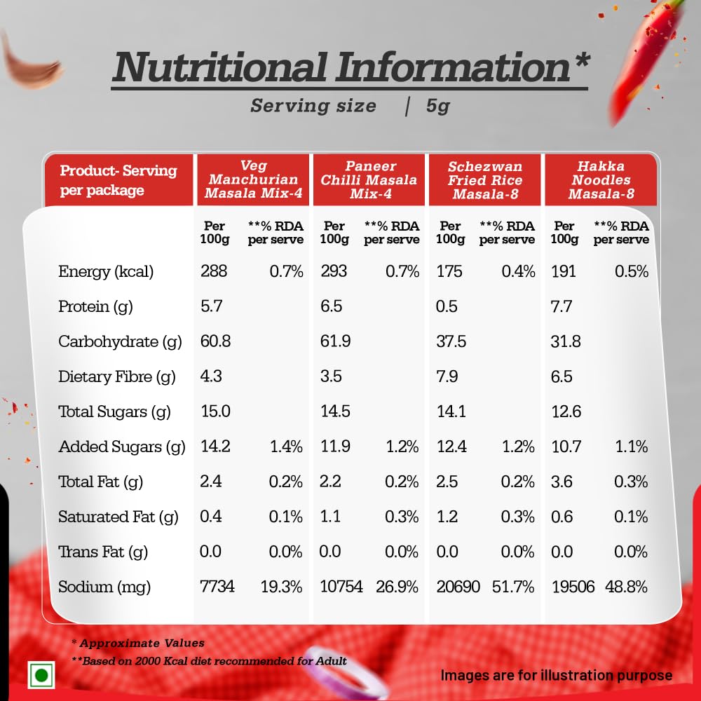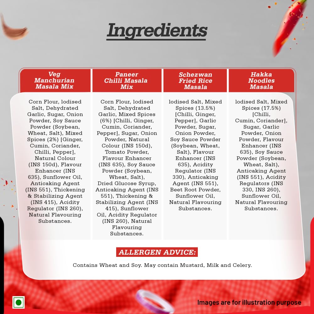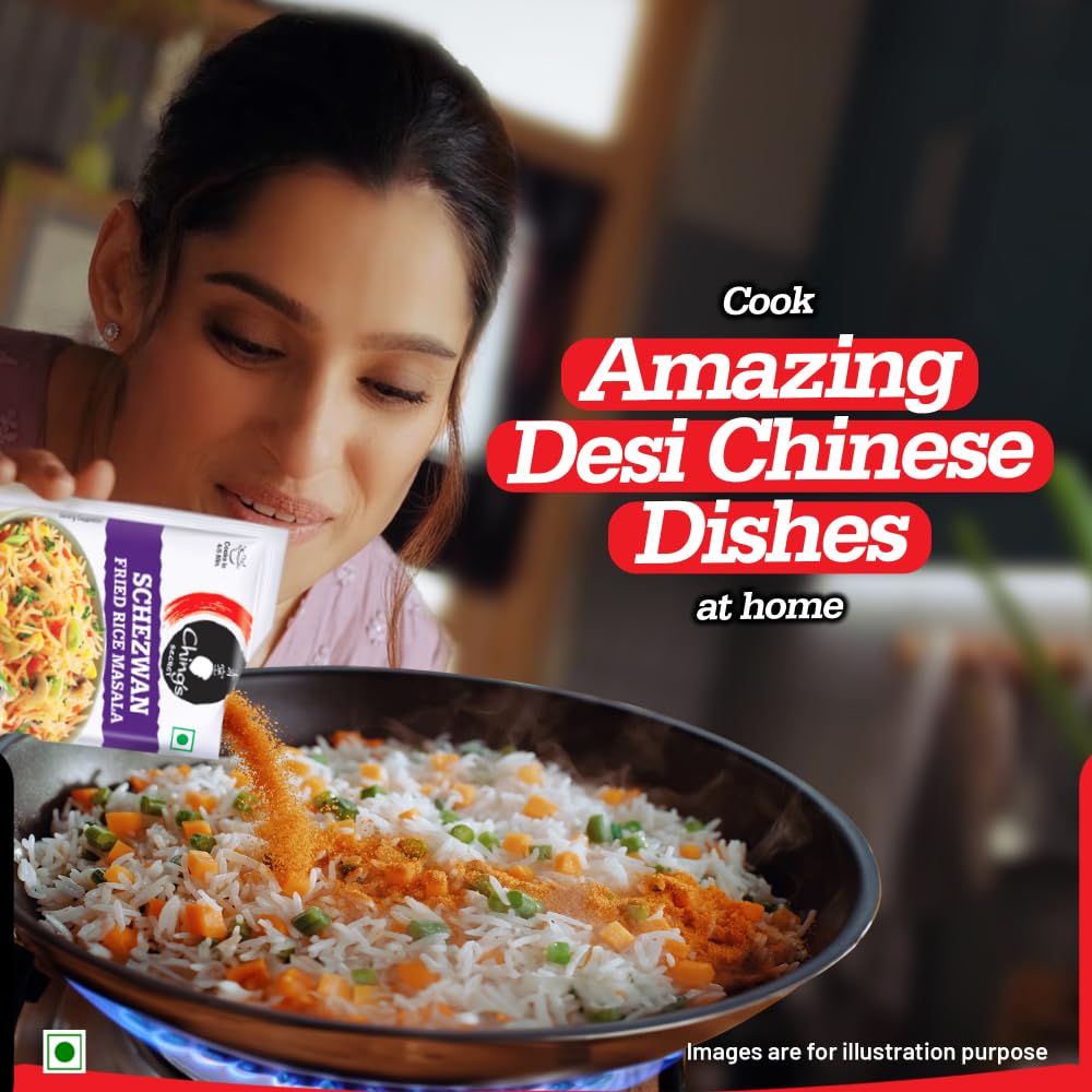 Easy-to-cook Meal Kit Now make India's favourite Desi Chinese dishes for your family at home! Cook up a different Desi Chinese dish every day with our Chinese Masala pouch. It contains all the dishes that your family loves - Chowmein Schezwan Fried Rice Paneer Chilli and Veg Manchurian. Ching's Desi Chinese Masalas are so perfectly blended that you don't even need to add any salt spice or sauce additionally. Cook up an entire Desi Chinese meal with total ease in a few simple steps. Ab jab bhi kare dil Ching's Desi Chinese nahin mushkil!