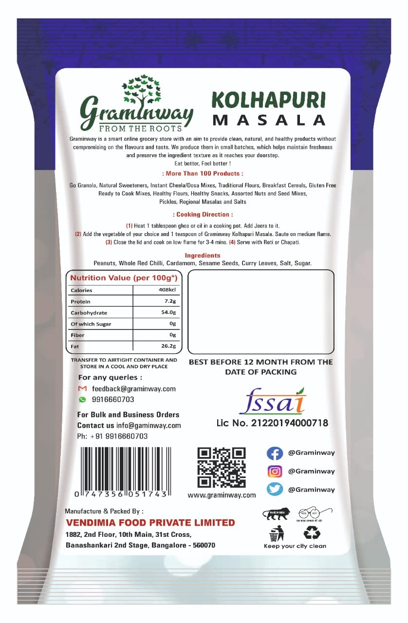 SPECIALTY of Graminway Kohlapuri Masala - is inspired by a region in Maharastra. It is made with garlic peanut sesame and other spices.