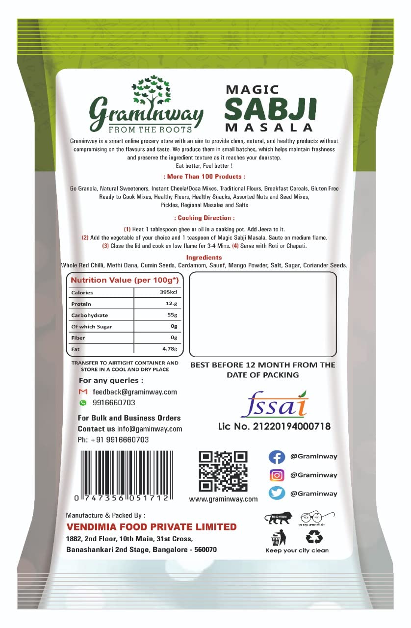 Graminway Magic Sabji Masala is speciality of our Chef. It can be added In any regular sabji to make it tastier and exotic. It is made with the finest of spices roasted in low flame to give best taste.