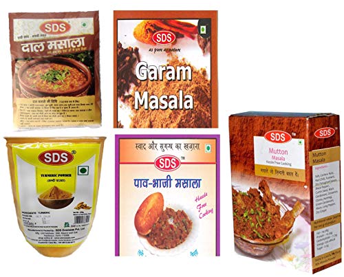SDS Masala 5 Piece Combo (1 Mutton Masala 80 gm + 1 Dal Masala 40gm + 1 Garam Masala 50gm + 1 Haldi 200gm + 1 Pav Bhaji Masala 50gm)