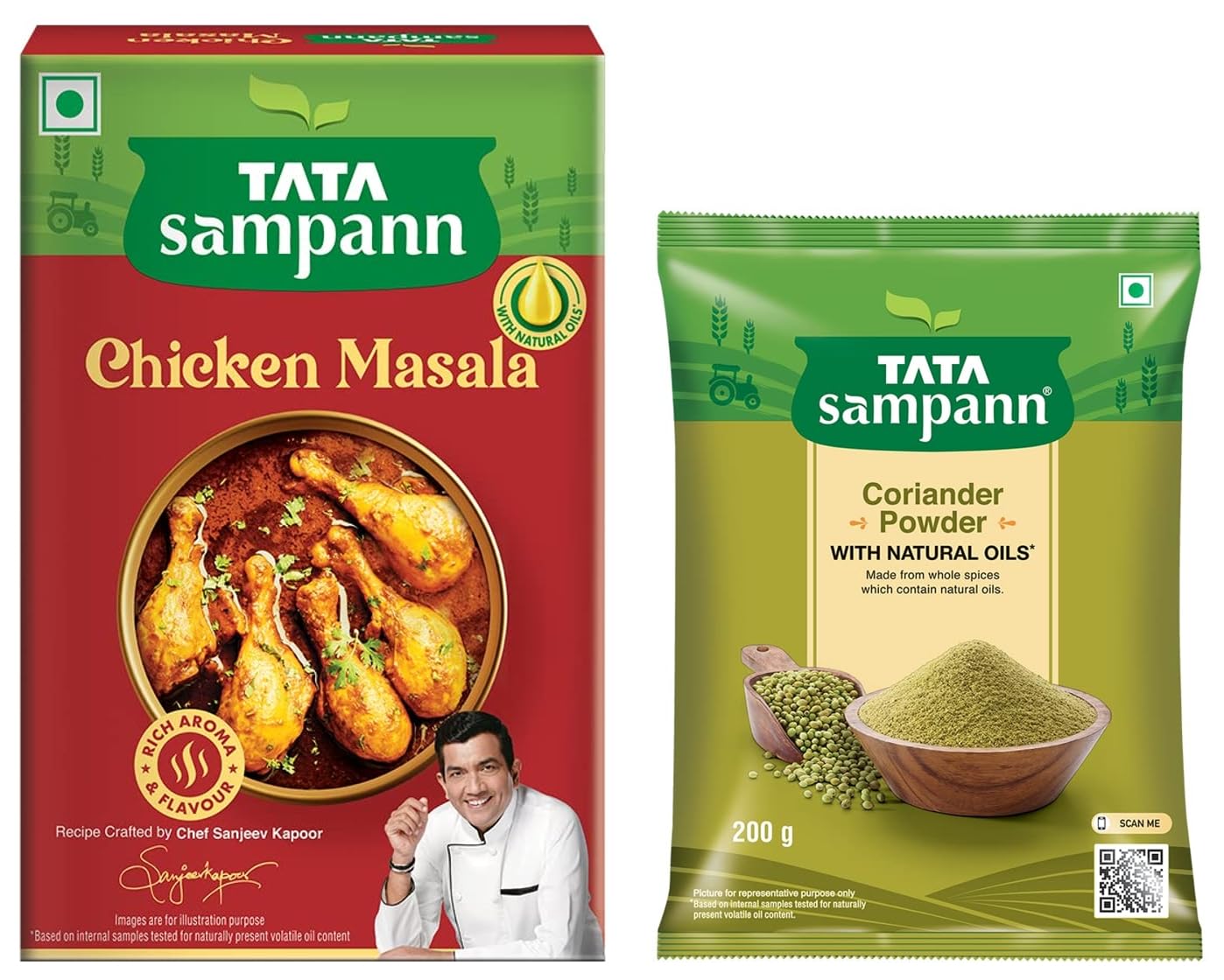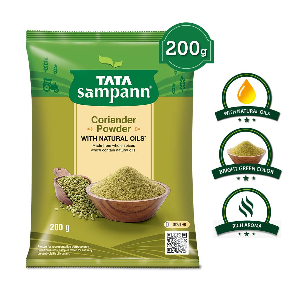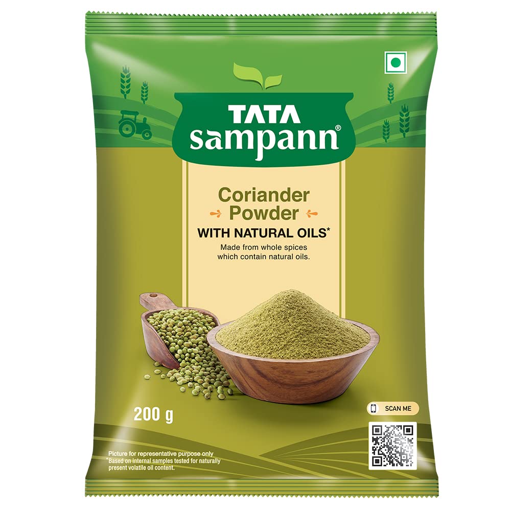 Tata Sampann Chicken Masala with Natural Oils Crafted by Chef Sanjeev Kapoor 100gTata Sampann Chicken Masala is specially crafted for you by Chef Sanjeev Kapoor to unleash the master chef within you. Tata Sampann spices are made to retain their natural oils ensuring each bite is aromatic and flavorful. Each pack comes with an exclusive Chef Tip to make every meal exciting! Now make tasty Chicken Curry at home and watch everyone lick their plates clean! Explore Tata Sampann Blended Spices Range Pav Bhaji Masala Paneer Masala Chhole Masala Chaat Masala Dal Tadka Masala Meat Masala Kitchen King Masala and Garam Masala. Chefs Tip: Use fried onion paste instead of chopped onions to add a different dimension to the dish.Tata Sampann Coriander Powder With Natural Oils 200gTata Sampanns range of spices are crafted not just to satisfy your taste buds but also to take care of your health. Made from whole spices that contain natural oils coriander gets its properties and taste from its naturally occuring volatile oils. With no added preservatives this dhaniya powder can be teamed up with paranthas aloo sabzi or rasam the choice is yours! Storage Instructions: Store in a cool and dry place.