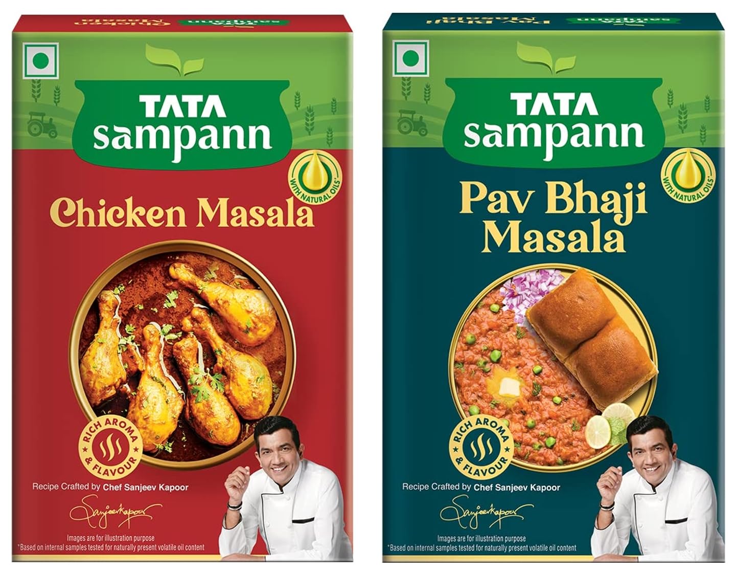 Tata Sampann Chicken Masala with Natural Oils Crafted by Chef Sanjeev Kapoor 100gTata Sampann Chicken Masala is specially crafted for you by Chef Sanjeev Kapoor to unleash the master chef within you. Tata Sampann spices are made to retain their natural oils ensuring each bite is aromatic and flavorful. Each pack comes with an exclusive Chef Tip to make every meal exciting! Now make tasty Chicken Curry at home and watch everyone lick their plates clean! Explore Tata Sampann Blended Spices Range Pav Bhaji Masala Paneer Masala Chhole Masala Chaat Masala Dal Tadka Masala Meat Masala Kitchen King Masala and Garam Masala. Chefs Tip: Use fried onion paste instead of chopped onions to add a different dimension to the dish.Tata Sampann Pav Bhaji Masala with Natural Oils Crafted by Chef Sanjeev Kapoor 100gTata Sampann Pav Bhaji Masala is specially crafted for you by Chef Sanjeev Kapoor to unleash the master chef within you. Tata Sampann spices are made to retain their natural oils ensuring each bite is aromatic and flavorful. Each pack comes with an exclusive Chef Tip to make every meal exciting! Now make Bombay Style Pav Bhaji at home and watch everyone lick their plates clean! Explore Tata Sampann Blended Spices Range Chaat Masala Paneer Masala Chhole Masala Chicken Masala Dal Tadka Masala Meat Masala Kitchen King Masala and Garam Masala. Chefs Tip: Toss leftover rice with vegetables and some Pav Bhaji Masala to make a quick Bombaiya Pulao.
