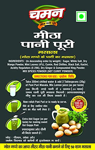 Chaman Pani Puri Meetha Masala add mouth-watering taste to your food. You can make your Own Panipuri at home with this Spice Mix while without worrying about going out in the summer heat to enjoy your Favorite Gol Gappe. Tasty and easy to prepare.