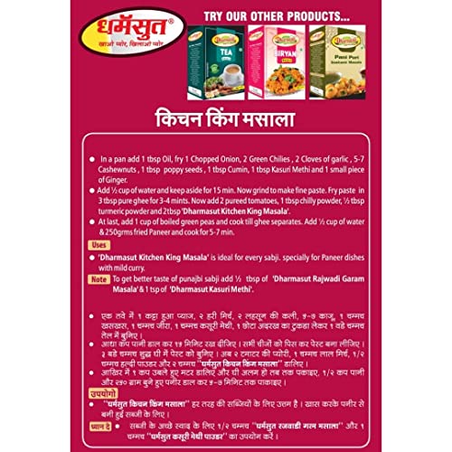 Dharmasut Kitchen King Masala is the king of all masalas it is a blend of all major spices used in cooking dishes like paneer subzis. This Dharmasut kitchen king masala has a strong spicy flavour and should be used sparingly. Kitchen King Masala jain is 100% organic with delicious taste.