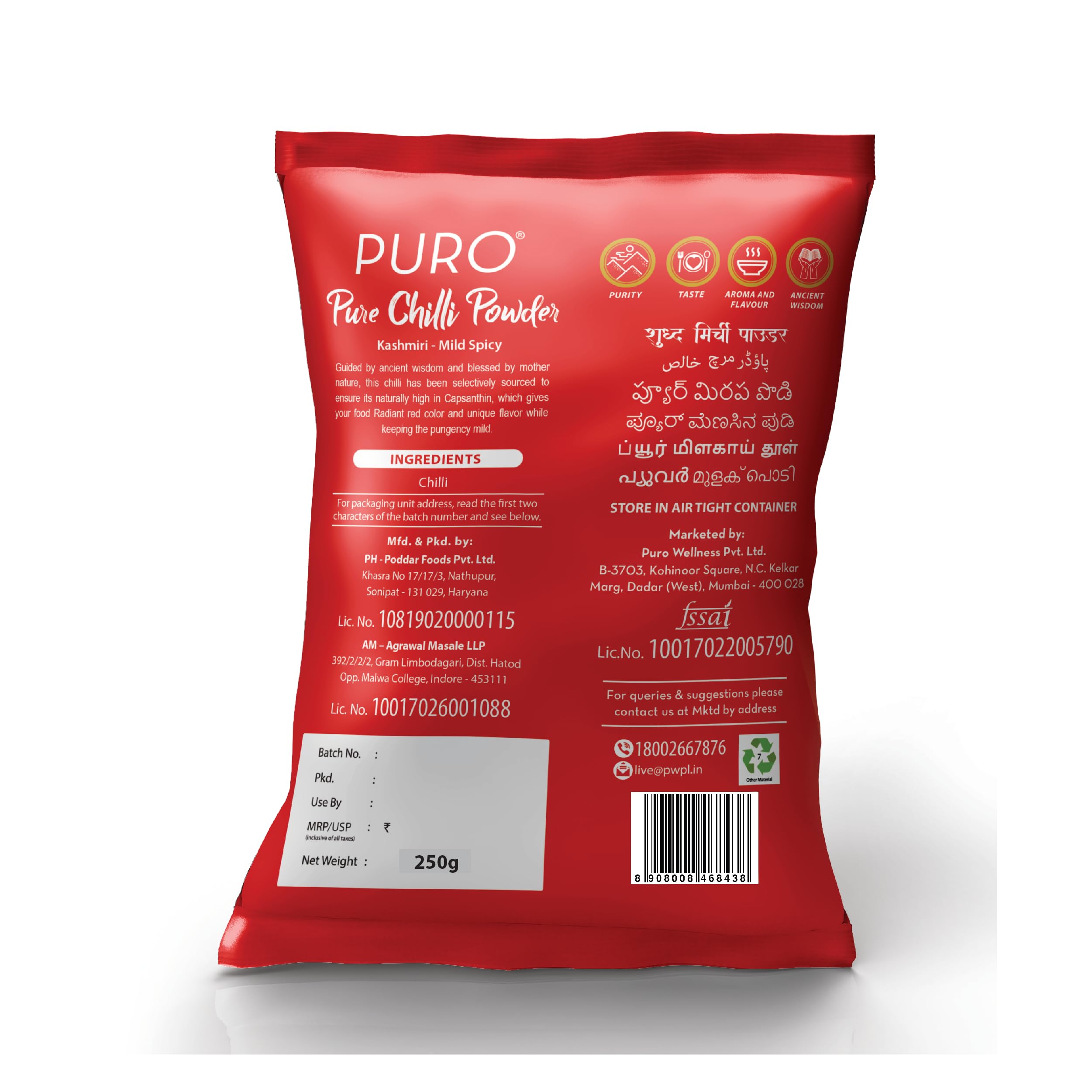Puro Pure Chilli powder is 100% natural and does not contain any additional additives/ colour /oil like others. This chilli is grinded using cool grinding technology to keep it's nutrients intact.