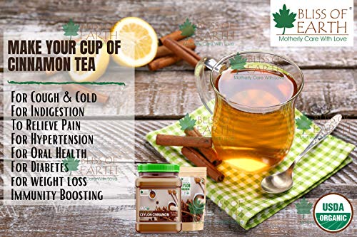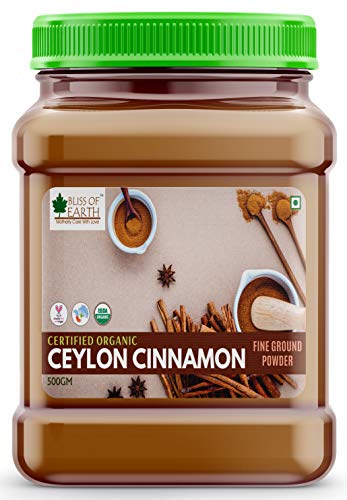 Bliss of Earth Certified Organic Ceylon Cinnamon Powder is a purer and healthier version of cinnamon. Ceylon cinnamon has a sweeter & delicate flavor than the more common Cassia cinnamon.In addition to its positive medicinal benefits ceylon cinnamon is ideal for all culinary usage.Our Ceylon Cinnamon is organically grown harvested and manually processed using traditional methods that have been used for centuries.Ceylon cinnamon known as true cinnamon is the purest form of cinnamon. Most commercial cinnamon is of the Cassia variety which has much less flavor or nutritional benefit since it contains much higher levels of coumarin. Ceylon cinnamon also has a more pleasant fragrance than the harsh pungent Cassia cinnamon. Use our pure cinnamon in your recipes and taste the difference.