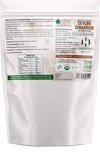 Bliss of Earth Certified Organic Ceylon Cinnamon Powder is a purer and healthier version of cinnamon. Ceylon cinnamon has a sweeter & delicate flavor than the more common Cassia cinnamon.In addition to its positive medicinal benefits ceylon cinnamon is ideal for all culinary usage.Our Ceylon Cinnamon is organically grown harvested and manually processed using traditional methods that have been used for centuries.Ceylon cinnamon known as true cinnamon is the purest form of cinnamon. Most commercial cinnamon is of the Cassia variety which has much less flavor or nutritional benefit since it contains much higher levels of coumarin. Ceylon cinnamon also has a more pleasant fragrance than the harsh pungent Cassia cinnamon. Use our pure cinnamon in your recipes and taste the difference.