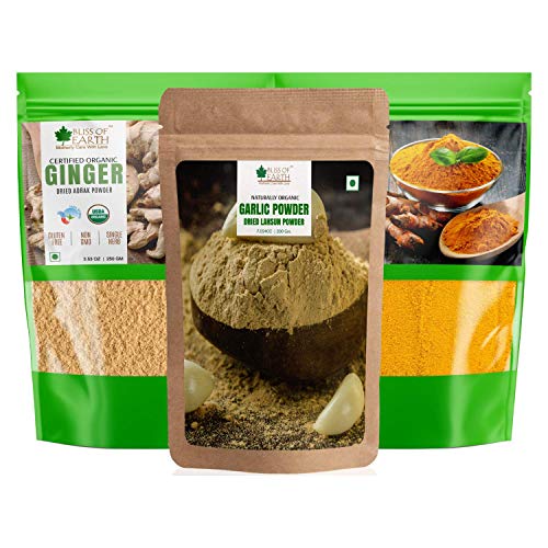 Bliss of Earth ginger powder is certified organic versatile herb known for centuries for its health benafits. We dehydrate the ginger at low tempratures so it ratain all the nutrients and amazing flavor. There are 115 chemical compounds found in ginger root making it a super antioxidant and anti-inflammatory agent. Ginger has been proven to aid in boosting immunity digestive support and cough & cold. We love how fresh ginger makes us feel. Its naturBliss of Earth Naturally Organic Garlic Powder is an excellent alternative of fresh garlic as it is made from dehydrated cloves of garlic. It enhances and gives the purest garlic flavor to all your favorite family recipes. Ingredients: Dried Garlic Powder Direction to use: Can be used as a seasoning in stews roasts gravies soups and sauces pizza and pasta etc. al flavor makes a perfect addition to your favourite juice smoothie or tea.