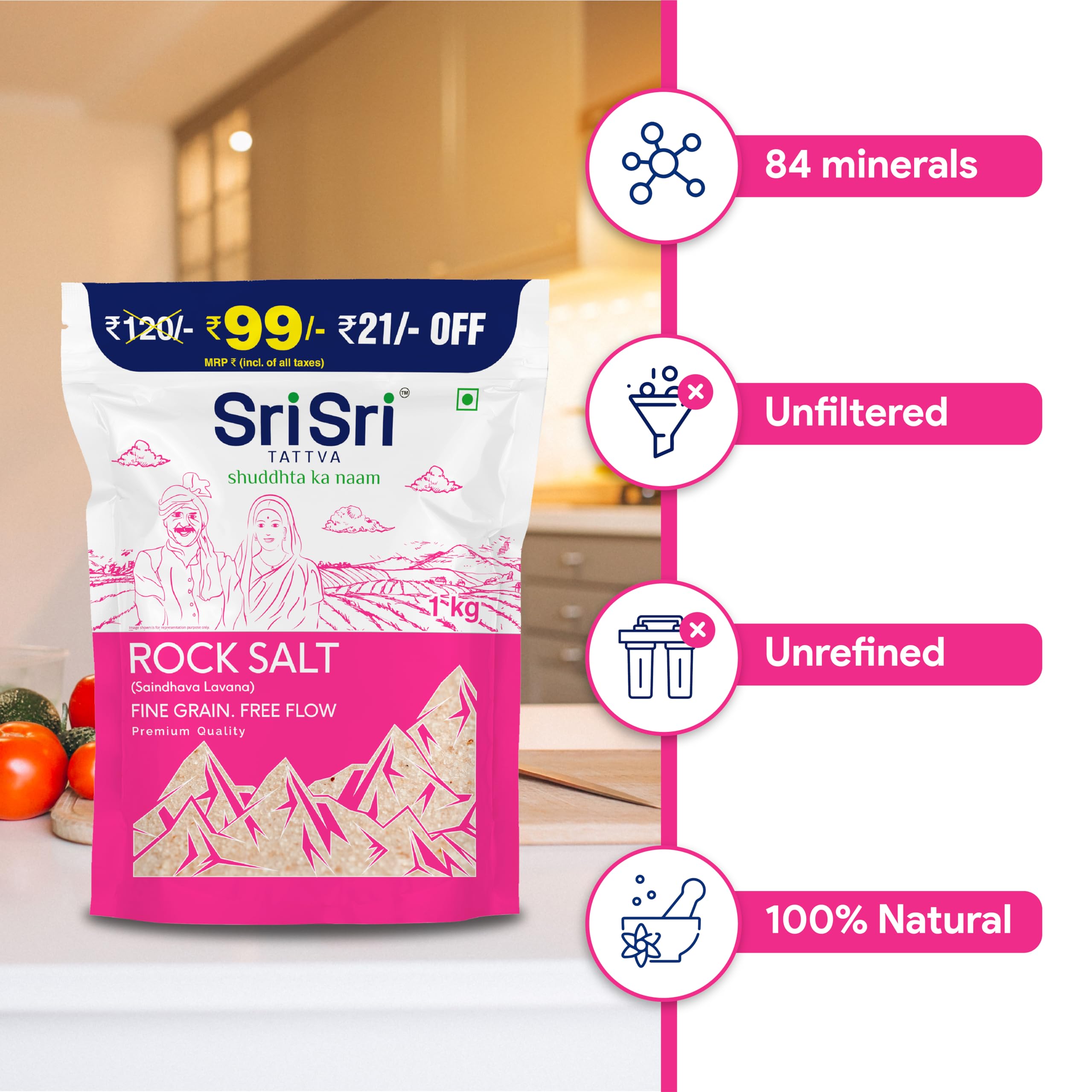 Rock Salt or Sendha Namak is among the oldest forms of Sodium Chloride and extensively used in daily meals. Ancient text has listed diverse benefits of Rock Salt. It is considered an excellent source of trace elements that help better absorption of nutrients and aids digestion. Add Sri Sri Tattva Rock Salt to flavour your daily food and benefit from its diverse attributes.