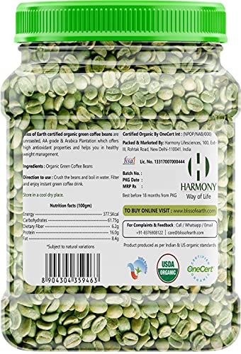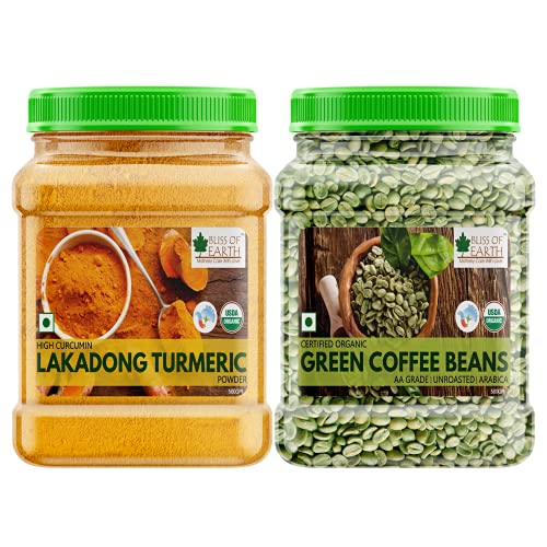 Bliss of Earth Organic Lakadong Turmeric Powder Bliss of Earth Lakadong Turmeric Powder is an organic versatile herb known for centuries for its health benefits. It offers an unmatched health benefits due to its highest natural curcumin content of 6-8% as compared to other turmeric powders. Grown in the hills of the Lakadong Village in Meghalaya Iindia this turmeric powder not only has a rich colour but also an intense flavour. It also has an aromatic fragrance that shows well when used in curries. Its natural flavor makes a perfect addition to your favourite curries vegetables or milk. The unroasted seeds of the plant Coffea Arabica Green coffee beans overflow with antioxidants that battle it out with free radicals that speed up skins ageing.It cleanses our liver freeing it from toxins bad cholesterols and unnecessary fats. A healthy liver henceforth enhances our metabolism leading overall better health. Laden with fatty acids and esters including Arahidic Acid Linoleic Acid and Oleic Acid Green Coffee Beans help prevent skin sagging droopiness and wrinkle formation. All of this contributes to a younger radiant and more vibrant skin