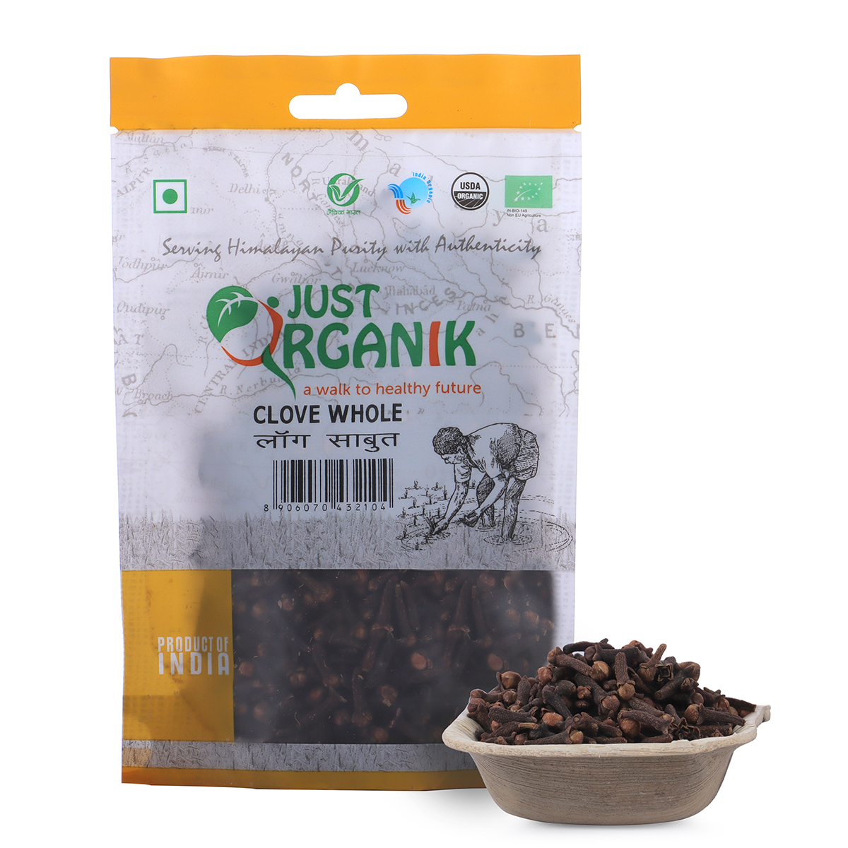 100% ORGANIC NO GMO, NO CHEMICALS, NO PESTICIDE INDIA ORGANIC, USDA CERTIFIED Our hand-picked cloves add a wonderful flavour to your special recipes. Just Organik Cloves have a warm, pungent and aromatic bouquet, and a sweetly pungent, astringent, and strongly aromatic flavor. In India, cloves are a key ingredient in the tea drink masala chai, in the garam masala spice blend, in South Indian biryani, and to dress up plain rice. It is also used for flavouring curries, Jellies, pickles, ketchup, sauces, spice mixtures and pickling spice. Sourced directly from Kerala, our Organic Clove has stimulating properties with many health benefits.