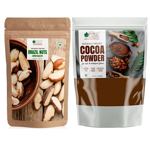 Bliss of Earth Brazil Nuts are nutritional powerhouse providing healthy fats vitamins and minerals. They are particularly high in selenium a mineral with potent antioxidant properties. Hazelnuts can be consumed as a raw snack roasted or added to baked dishes such as cake chocolates & shakes. All in all brazil nuts are an excellent and delicious source of nutrients for a healthy diet. Direction for use: Consume raw roasted or salted. Add to your cake chocolates or shakes. Bliss of Earth Naturally Organic Cocoa Powder is the perfect companion to any health concious kitchen. From holiday desserts and everyday baking to a steaming cup of cocoa on those chilli mornigs our cocoa powder offers a guil-free way to satisfy your sweet tooth without the high amount of sugar fat and preservatives which are commonly available in other mixes. In addition to its rich and indulgent flavor it is non-alkalinized and also has naturally occuring cocoa flavonols (polyphenols).