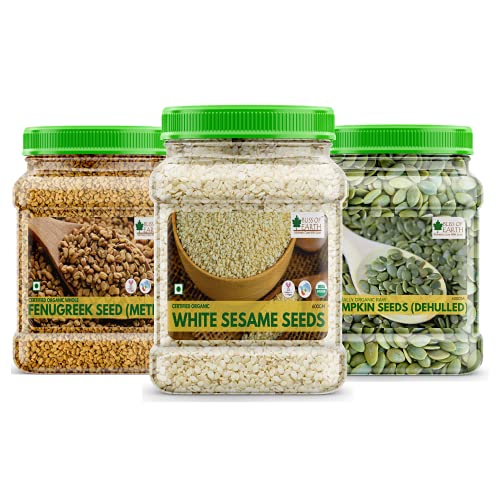 Bliss of Earth Organic White Sesame seeds are dehulled and are excellent source of copper calcium omega fatty acids iron magnesium phosphorus zinc and selenium. Sesame Seeds are also a good source of fiber with a rich nutty flavour. Called the queen of oil seeds these tiny seeds are a go-to topping on breadsticks and burger buns. Ingredients: Organic Sesame Seeds Bliss of Earth Certified Organic Fenugreek seed popularly known as Methi is one of the main culinary spice and is traditionally known to soothe upset stomach and maintain liver & kidney health. Bliss of Earth Naturally Organic Pumpkin Seeds are dehulled and are one of the healthiest superfood. They are loaded with nutrients that can provide a substantial amount of healthy fats magnesium and zinc. Incorporating these seeds in your diet improves heart health & prostate health.