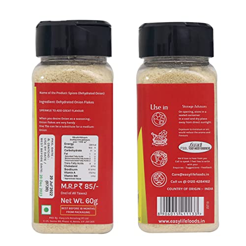 HomeGrocerySpicesWhole SpicesDry FlakesEasy Life Onion Flakes 60g [Pack of Only 2 Spices Dry Powdered use in Rice Bread - Combine with Garlic or Ginger and Make Your own Seasoning]