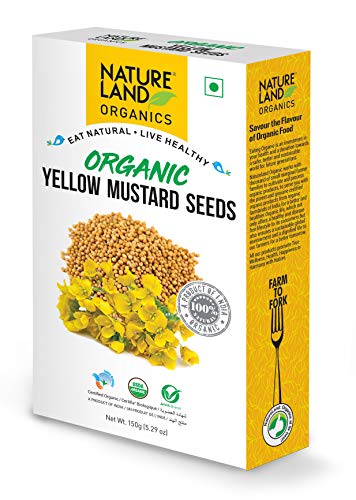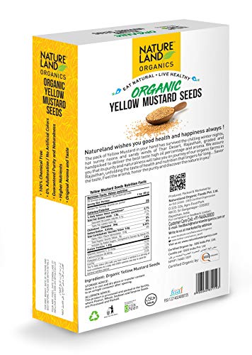 Nature land organic foods yellow mustard seed is of traditional variety having bold yellow grains spicy aromatic taste and fragrance a very popular oil seed crop in Gujarat and Rajasthan they are uniform in shape size and colour and have its own pungency characteristic. These seeds are free from living insects mites and moulds and are free from any dead insects fragments and rodent contamination. Mustard is a very good source of selenium and omega-3 fatty acids and a good source of phosphorous magnesium manganese dietary fibre iron calcium protein niacin and zinc.