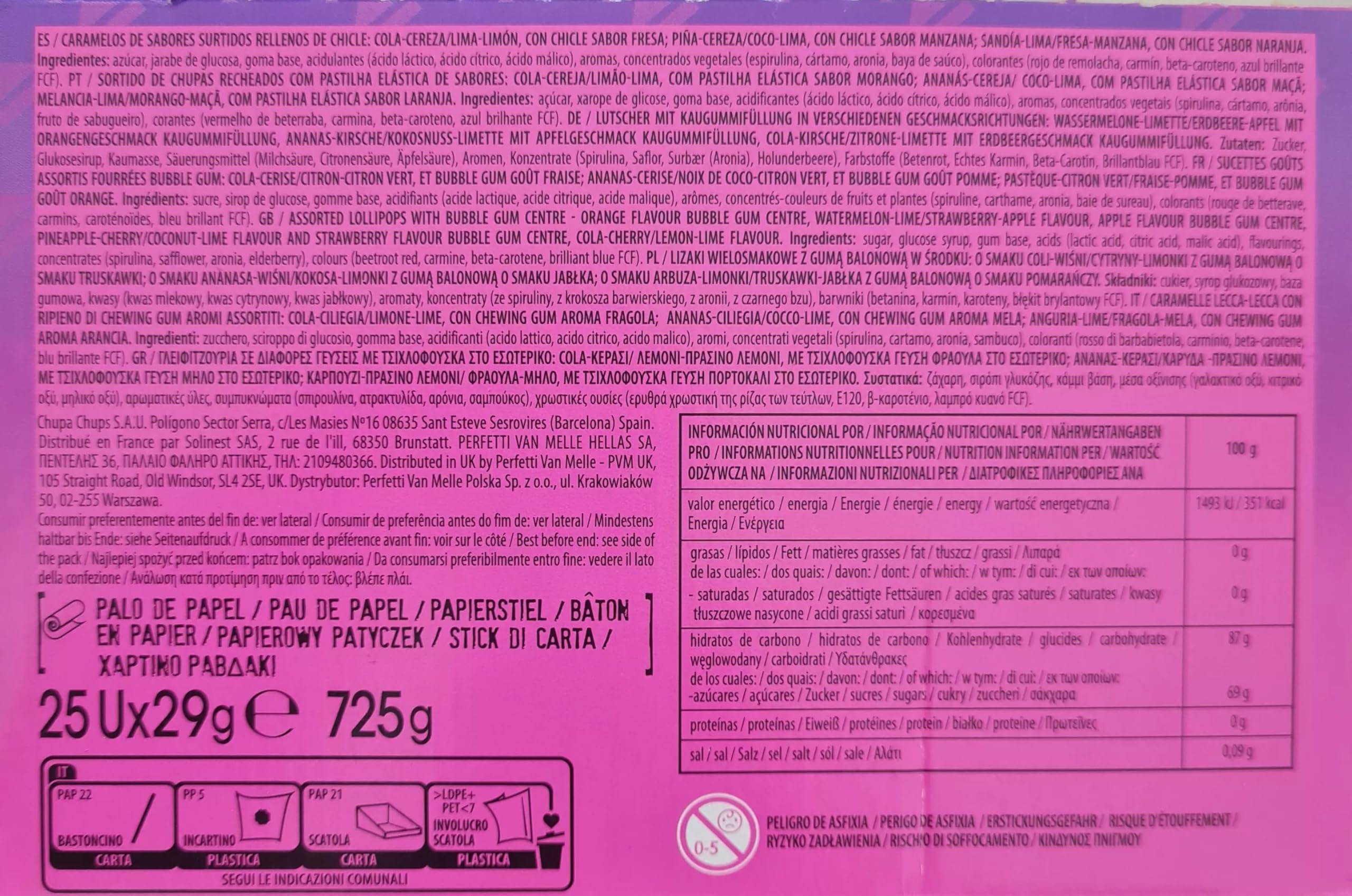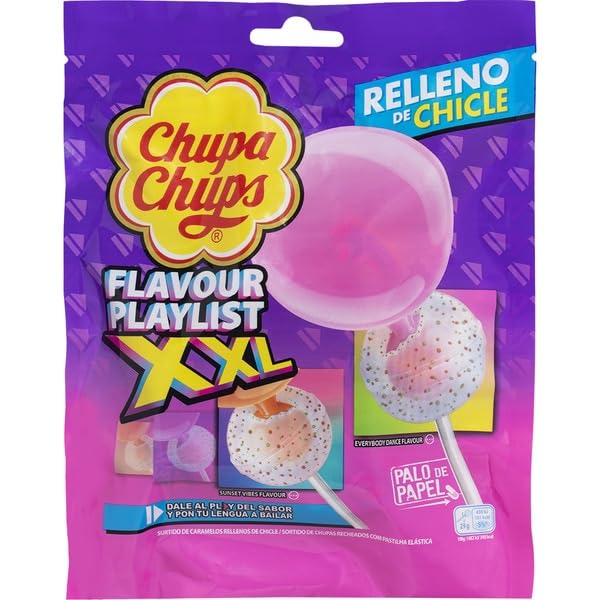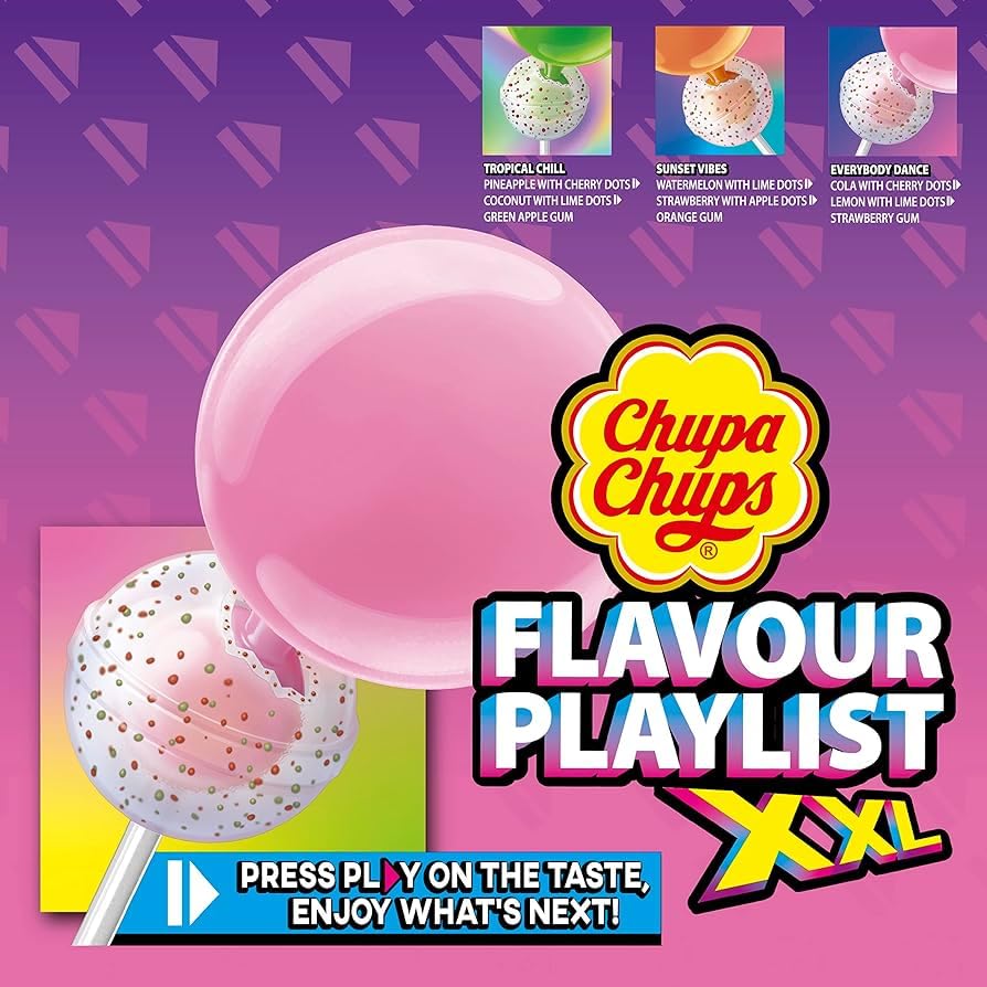 Indulge in a delightful flavour extravaganza with Chupa Chup XXL Flavour Playlist Lollipops! This assortment of 25 massive 29g lollipops offers an exciting mix of tantalising flavours. Savour the tropical burst of strawberry and mango or relish the zesty notes of orange all encapsulated in a vibrant hard candy shell. But the real surprise lies within - a delectable bubble gum centre awaits adding an extra layer of fun and flavour to your indulgence. Perfect for sharing with friends or satisfying your own sweet cravings these XXL lollipops are a true flavour adventure in every bite. Grab a pack and embark on a delicious journey of taste sensations!