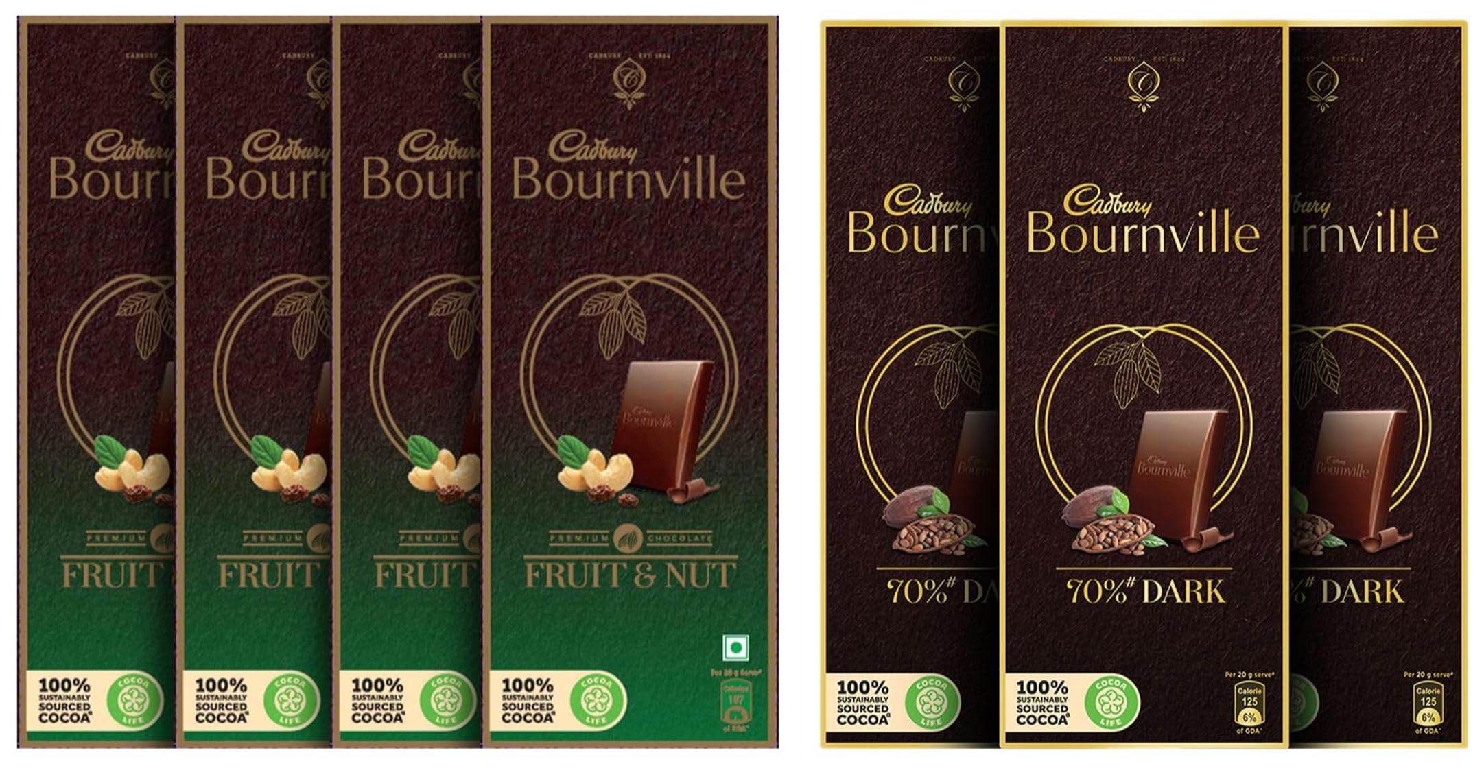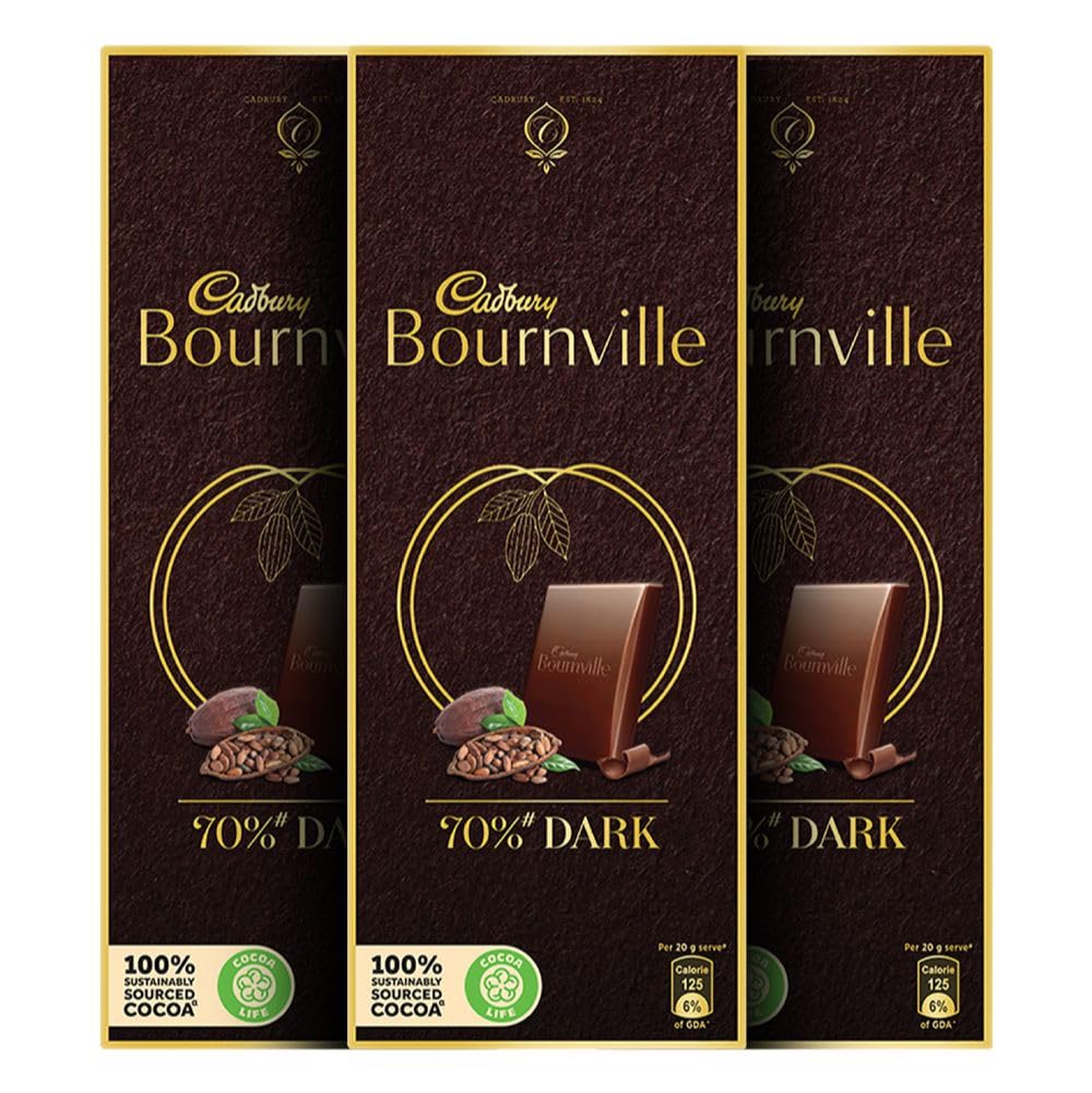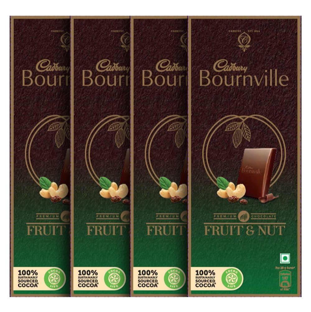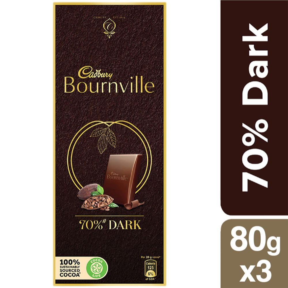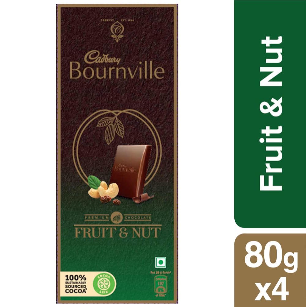 Cadbury Bournville Fruit and Nut Dark Chocolate Bar 80 g (Pack of 4)Cadbury Bournville is a premium dark chocolate that delivers an intense fine and indulgent experience to lovers of dark chocolate! Each Bournville dark chocolate bar is made from the finest cocoa sourced from some of the best places around the world perfectly roasted for an intense taste. Dark chocolate with lower quantities of sugar is known for its health benefits. Cadbury Bournville is made from the finest ingredients that give you a rich intense lingering taste. This dark chocolate pack is perfect to gift or to reward yourself with an immersive intense experience. Along with this fruit & nut dark chocolate also try other variants of Bournville chocolate 50% dark 70% dark and cranberry. Every chocolate box of Cadbury Bournville is made from 100% sustainably sourced cocoa. It is suitable for vegetarians.Cadbury Bournville Rich Cocoa 70% Dark Chocolate Bar 3 x 80 gCadbury Bournville is a premium dark chocolate that delivers an intense fine and indulgent experience to lovers of dark chocolate! Each Bournville dark chocolate bar is made from the finest cocoa sourced from some of the best places around the world perfectly roasted for an intense taste. Dark chocolate with lower quantities of sugaris known for itshealth benefits. Cadbury Bournville is made from the finest ingredients that give you a rich intense lingering taste. This dark chocolate pack is perfect to gift or to reward yourself with an immersive intense experience. Along with this 70% dark chocolate also try other variants of Bournville chocolate 50% dark cranberry and fruit & nut. Every chocolate box of Cadbury Bournville is made from 100% sustainably sourced cocoa. It is suitable for vegetarians.