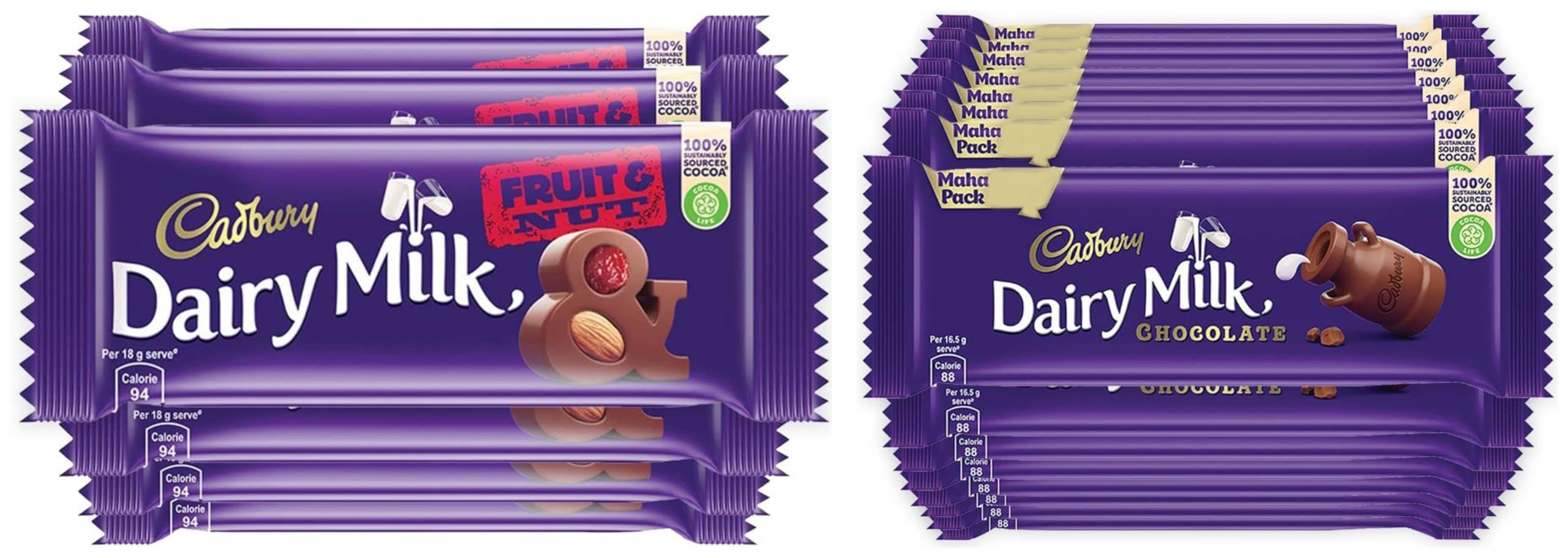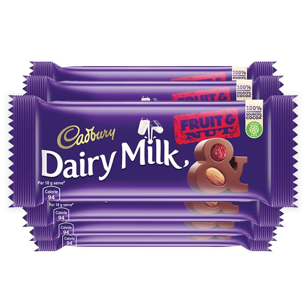 Cadbury Dairy Milk Chocolate Bar 15 x 55 g Maha PackKuch achha ho jaaye kuch meetha ho jaaye with Cadbury Dairy Milk. Generously made with a glass and half of milk offering a mouthful of goodness in every piece. This pack includes 15 packs of 55g Cadbury Dairy Milk Chocolate Maha Pack. This pack of milk chocolate bars is perfect for snacking & storing in the fridge or for gifting & sharing on special occasions like birthdays and get-togethers. Every bar of Cadbury Dairy Milk is made from 100% sustainable cocoa. It is suitable for vegetarians.Cadbury Dairy Milk Fruit & Nut Chocolate Bar Pack of 6 x 80gKuch achha ho jaaye kuch meetha ho jaaye with Cadbury Dairy Milk. Generously made with a glass and half of milk Cadbury Dairy Milk also has raisins & nuts. Cadbury Dairy Milk is the perfect meetha for sharing everyday moments of joy with your loved ones. This pack includes 6 packs of 80g Cadbury Dairy Milk Fruit & Nut Chocolate. This pack of milk chocolate bars is perfect for snacking & storing in the fridge or for gifting & sharing on special occasions like birthdays and get-togethers. Every bar of Cadbury Dairy Milk is made from 100% sustainable cocoa. It is suitable for vegetarians.