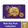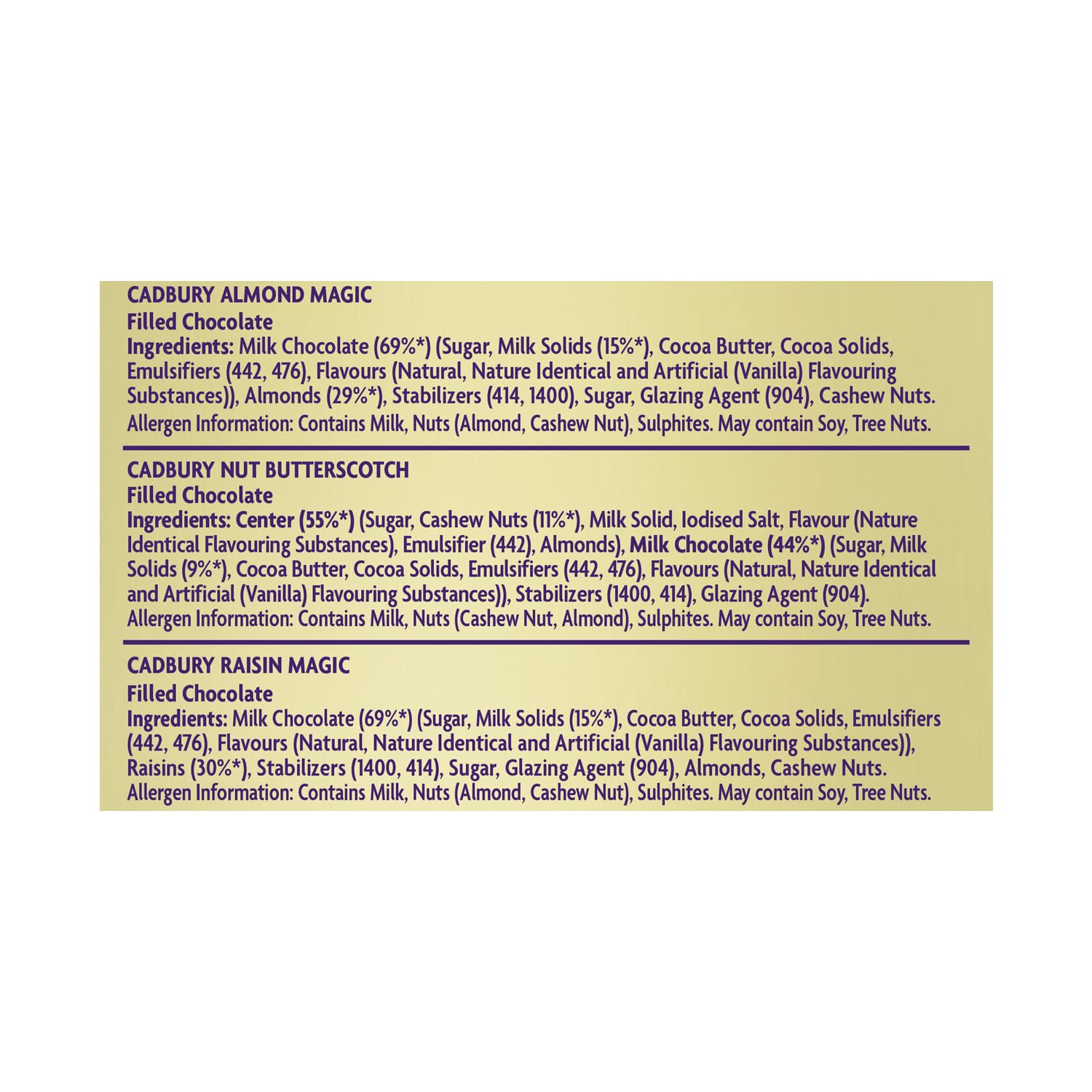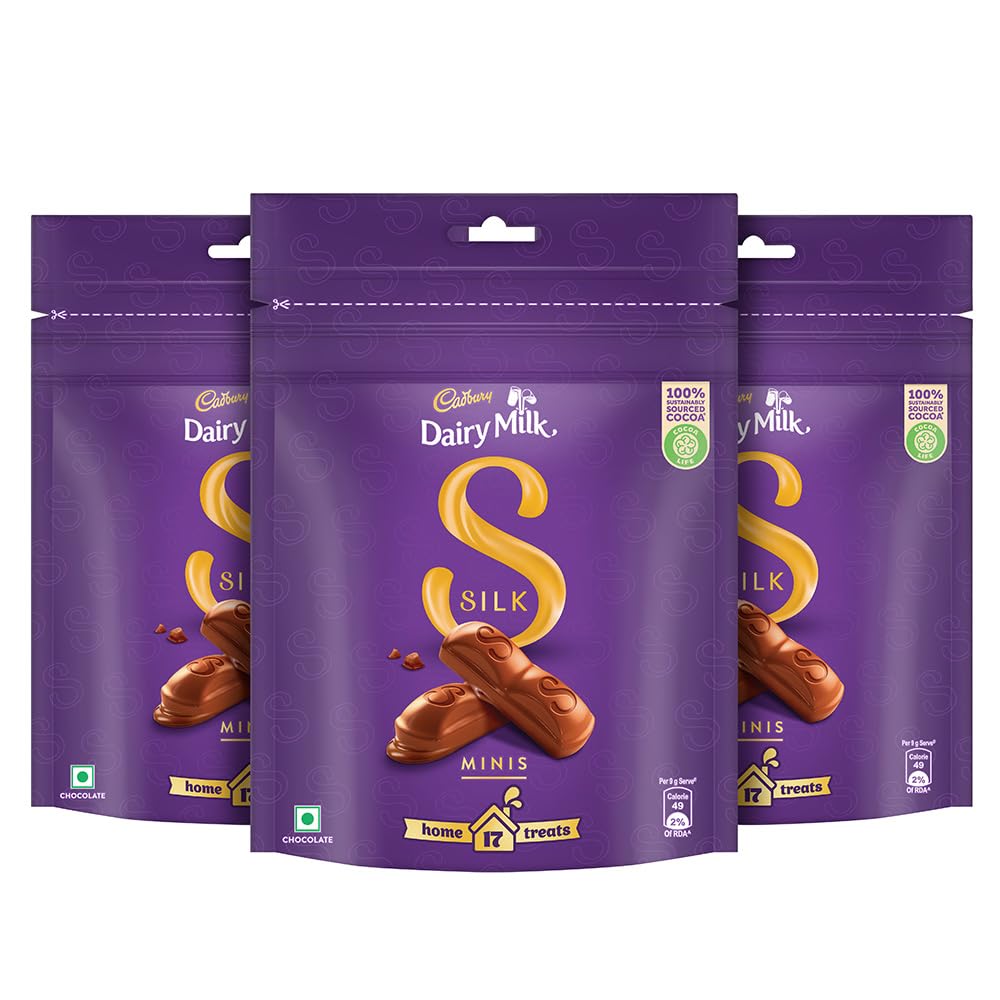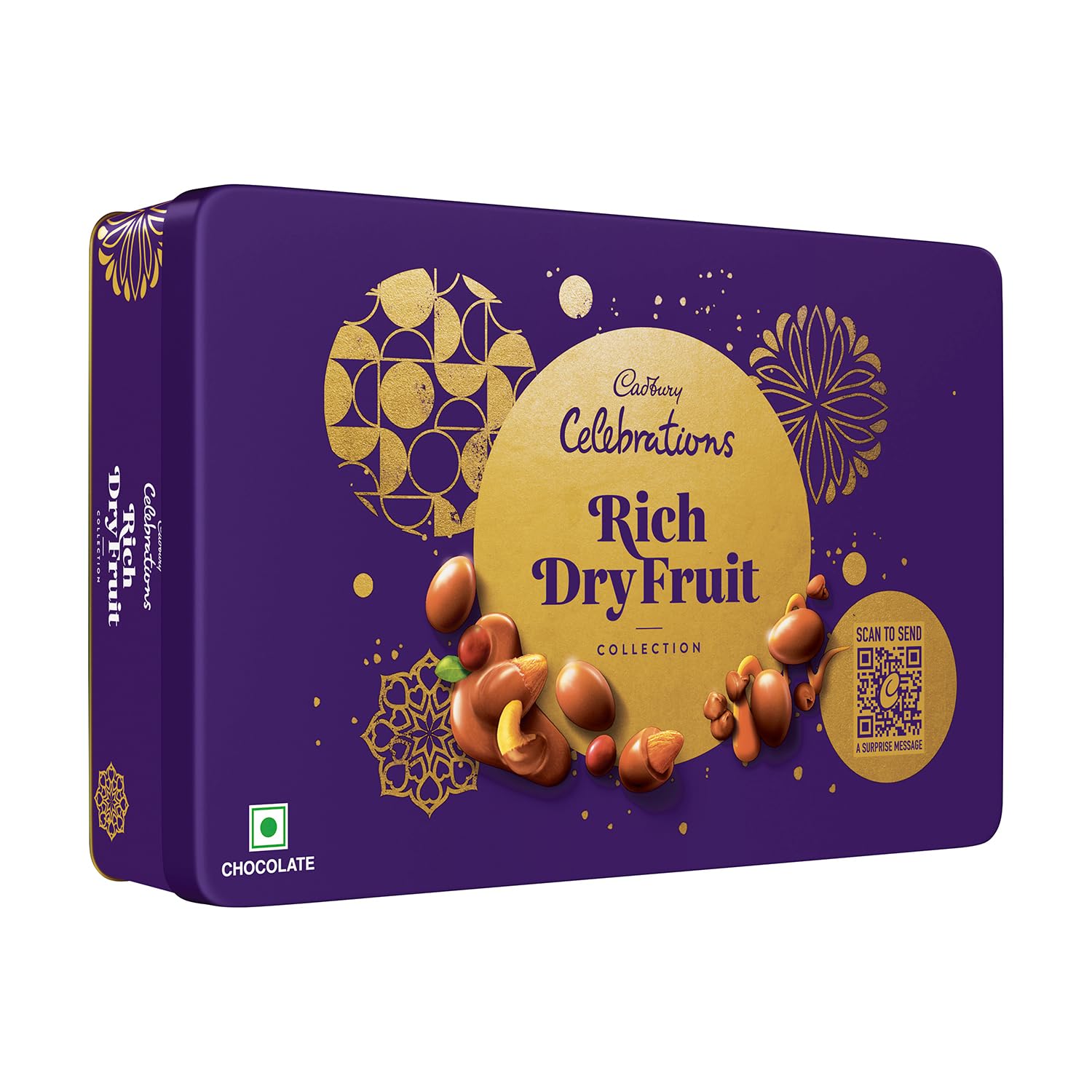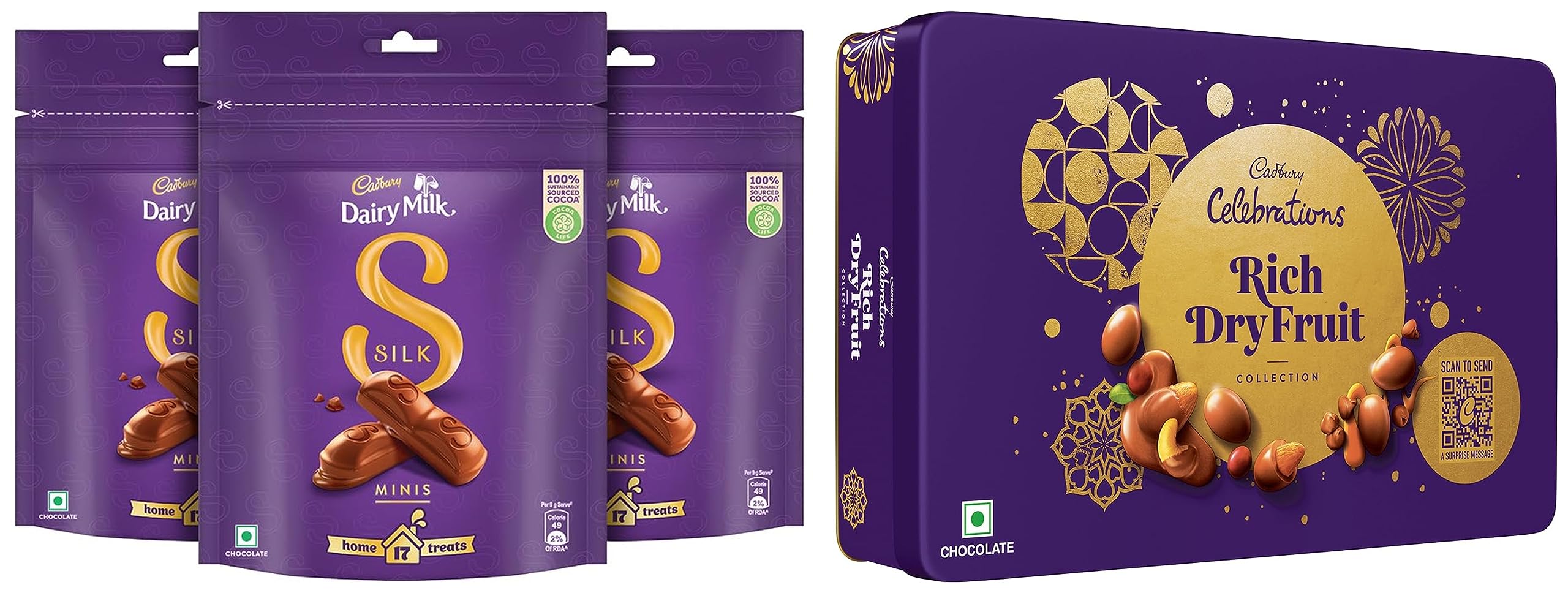 Cadbury Dairy Milk Silk Chocolate Home Treats 153 g - Pack of 3Cadbury Dairy Milk Silk is all about regaling in the richness and creaminess of the chocolate. Indulge in a rich smooth and creamy celebration. Silk: The classic taste of Cadbury Dairy Milk chocolates only more creamy more smooth more indulging. Cadbury Dairy Milk Silk is made with a glass and a half of milk.This milk chocolate home treats pack is perfect sweet for snacking & storing in the fridge or as a chocolate gift pack for special occasions like birthdays and get-togethers. Every bar of Cadbury Dairy Milk Silk is made from100% sustainably cocoa. It is suitable for vegetarians.Cadbury Celebrations Rich Dry Fruit Collection Chocolate Gift Box 177 gDiscover the collection of Cadbury Celebrations gift box with your favourite Cadbury chocolates inside. This assorted gift box contains 5 units of Cadbury Dairy Milk Milk Chocolates-12g 2 units of Cadbury 5 Star-20g 1 unit of Cadbury Gems-7.9g 1 unit of Cadbury Dairy Milk Milk Chocolate-23g. This collection comes in a premium gift pack which makes it a perfect gift to share with your family and friends. This pack contains 4 units of Cadbury Celebrations Assorted Chocolate Gift Pack 130.9g.Discover the gift of Cadbury Celebrations Rich Dry Fruit gift box that makes for a perfect and memorable gift to celebrate Diwali. This pack contains Almonds Cashews & Raisins enrobed in rich chocolate which gives a unique experience of dry fruits & chocolate engaging all your senses. It is packed and delivered with frozen gel packs (reusable) to maintain temperature & quality during transit.
