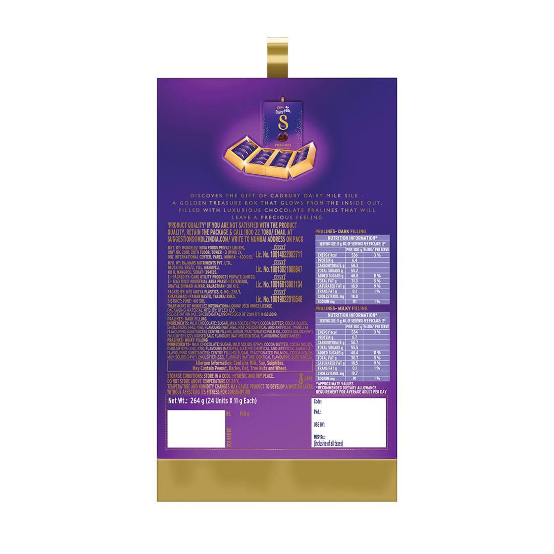Kuch achha ho jaaye kuch meetha ho jaaye with Cadbury Celebrations. Filled with the goodness of Cadbury chocolates the perfect gift for those whose presence makes every occasion perfect. Made with love a chocolate box meant for every occasion-a Rakhi gift for your brother or sister a special one's Birthday Diwali with family create moments to cherish with Cadbury. This Cadbury milk chocolates gift pack contains 24 delectable pralines with milky and dark chocolate filling Every bite of Cadbury chocolate bars is pure magic and an unforgettable feeling! Perfect for gifting your loved ones on every occasion. Store this in a cool dry and hygienic place as per back of pack instructions. Just like every bar of Cadbury Dairy Milk Silk this is suitable for vegetarians.