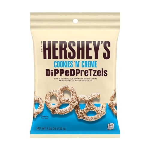 delightful combination of sweet and salty with Hersheys Cookies 'n' Cream Dipped Pretzels. These pretzels are coated in a smooth layer of white creme featuring the classic Cookies 'n' Cream flavor with added cookie bits for a satisfying crunch. The result is a delicious snack that combines the creaminess of white creme with the texture and flavor of chocolate cookies