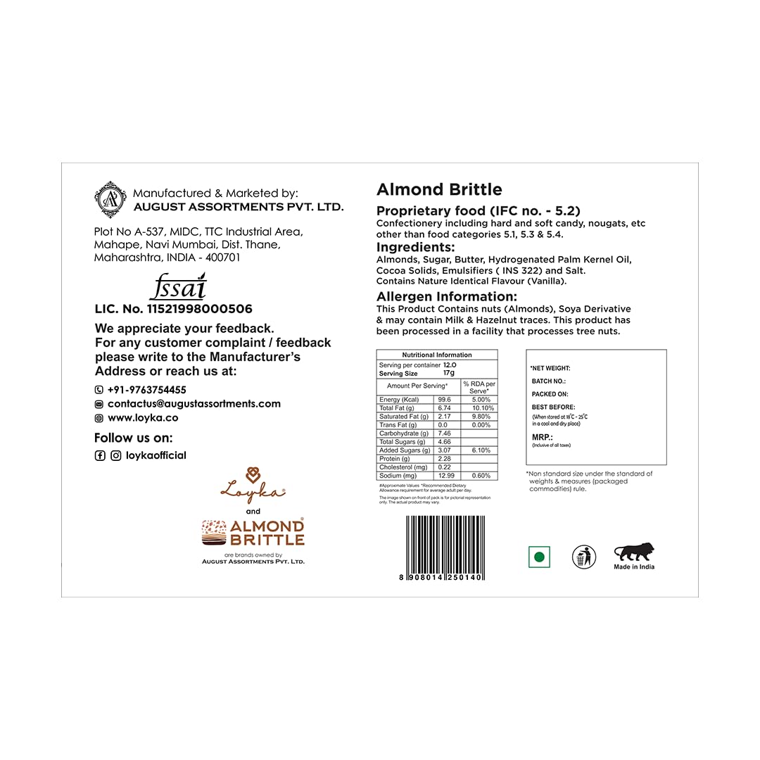 Crunchy texture : Our Almond Brittle has a satisfying crunch that adds an enjoyable texture to any snack or dessert.