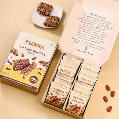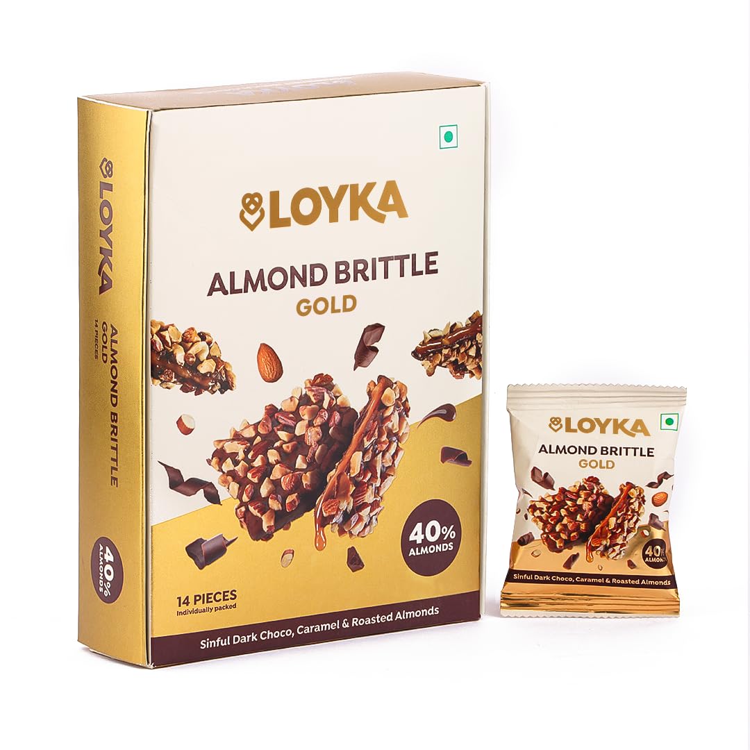 LOYKA Almond Brittle Gold Choco Box 14 Pcs (Pack of 1) | Premium Chocolate Gift Hamper|Choco & Nut Dryfruit Delicacy|Roasted California Almonds (40%)Dark ChocoSalted CaramelAny-Time Snack