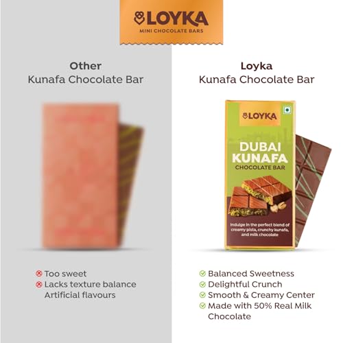 Savor the rich and luxurious taste of Loyka Dubai Kunafa Chocolate a gourmet treat that brings together the irresistible flavors. his delightful creation offers an exquisite combination of textures and flavors making it the ultimate indulgence for chocolate lovers. Harmoniously balanced with the nutty essence of pistachios and coated in a silky-smooth layer of 50% milk chocolate. Crafted with the finest ingredients this chocolate delicacy is inspired by the traditional Kunafa dessert reimagined in a luxurious chocolate experience. Perfect for gifting celebrations or self-indulgence Loyka Dubai Kunafa Chocolate is a premium gourmet treat that promises a heavenly taste with every bite.