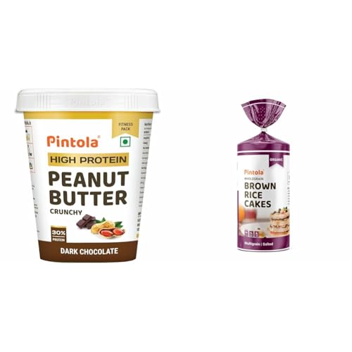 PINTOLA High Protein Peanut Butter Chocolate Flavour Crunchy 510g Added WHEY Protein 30g Protein 6.2g Fiber Gluten Free Zero Trans Fat Dark Chocolate Peanut Butter Spread Nut Butter Bread SnacksWe created a perfect combination of health deliciousness with roasted peanuts imported Whey protein and Dark Chocolate. The Whey protein being used is being imported from the world's top dairy based in New Zealand. High Protein Dark Chocolate Peanut Butter has been created carefully for fitness freaks and gym-goers. They simply can't get enough of this perfect creation!! The deliciousness of dark chocolate added to the all-natural peanut paste and imported whey protein makes this product the best addition to a diet one can ever ask for. High in protein and fibre and ZERO in trans fat. All PINTOLA® Products are made up of the finest grade fresh and nutritious ingredients from an ISO 22000 Certified and FSSAI approved Factory. We manufacture Indiaâs favorite Nut Butters daily so that you get the freshest product every time you buy one. "Suitable for all age groups". Ideal for Gym & Fitness Enthusiasts Athletes & all Foodies!Pintola Organic Wholegrain Brown Rice Cakes - Multigrain (Salted) (Pack of 1) 130 g | All Natural | 9 Wholegrain | No Cholesterol | Low Fat | Soy and Yeast Free | Only 30 Calories Per CakeWhy settle for bread when you can have something even better? Pintola's Multigrain Rice Cake is a healthier and more filling alternative that'll help you stay active and maintain good health. Low on calorie it is baked with 9 wholegrains and is the perfect mini-snack to tide you over until your next meal. So why wait? Head over to Amazon and grab a pack today!