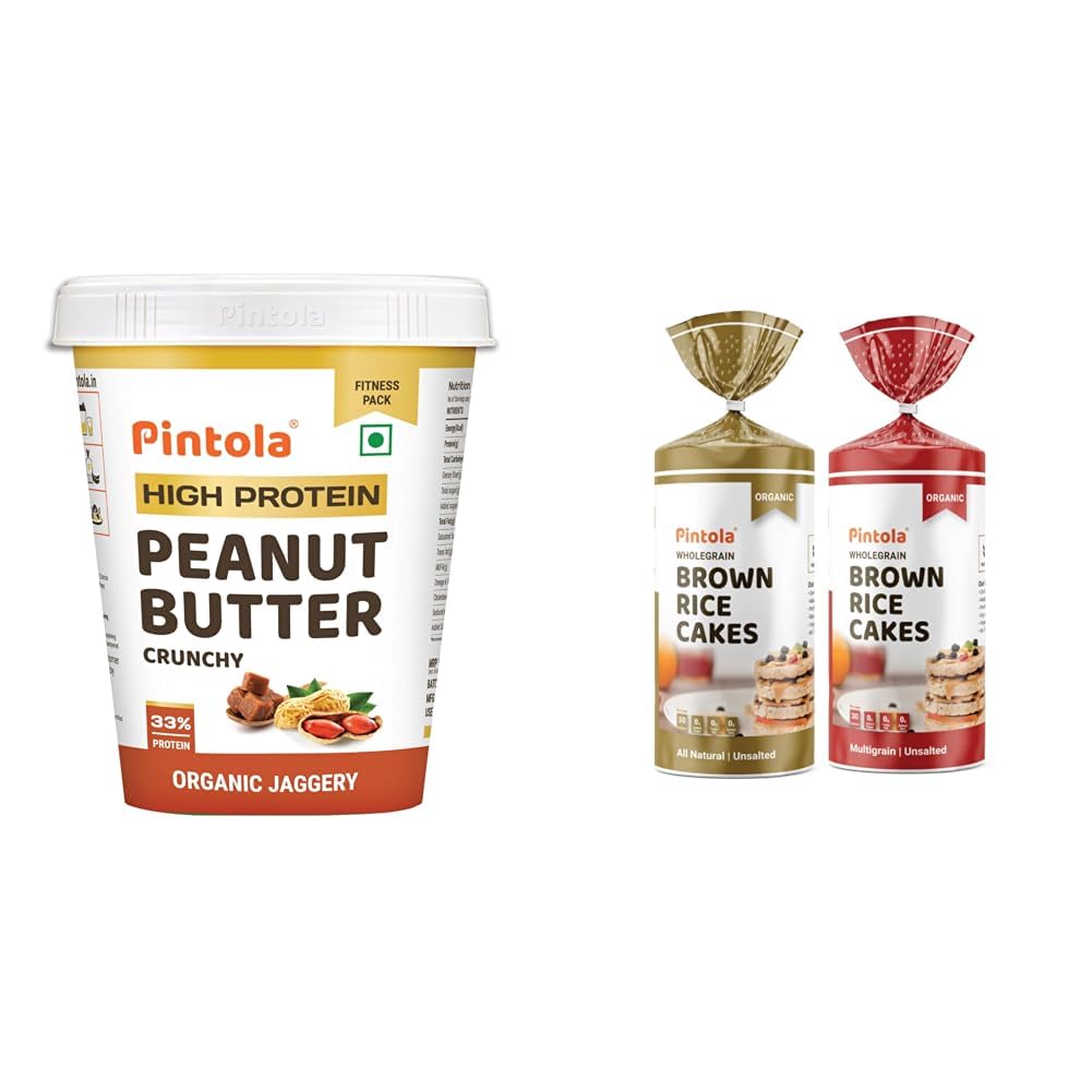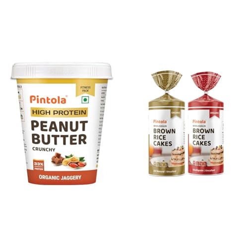 Pintola HIGH Protein ORGANIC JAGGERY Peanut Butter Crunchy 1kg with 33g Protein & 7g Fiber Whey Protein Peanut Butter Vegan Gluten Free Zero Added Salt Cholesterol Free 100% Roasted PeanutsRoasted Peanuts Whey Protein ConcentrateOrganic JaggeryPintola Organic Wholegrain Brown Rice Cakes Combo Pack (All Natural) (Multigrain and Unsalted) (130 g x 2)Made with Organic Whole Grain Brown Rice